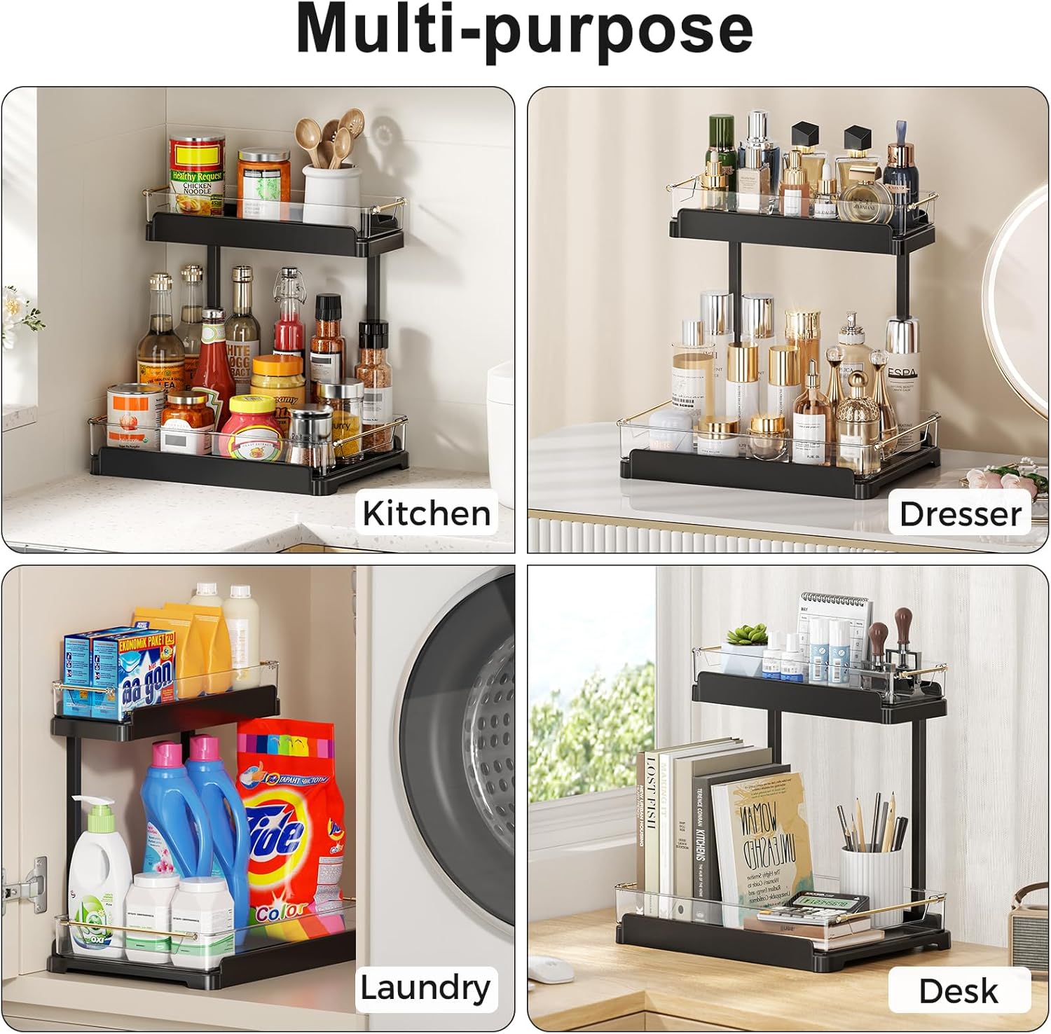 - 【Multi-Space Fit】 This bathroom storage organizer is perfect for kitchen, bathroom & laundry room. Fits seamlessly into under sink, cabinet, countertop, pantry, and tight space to double storage instantly