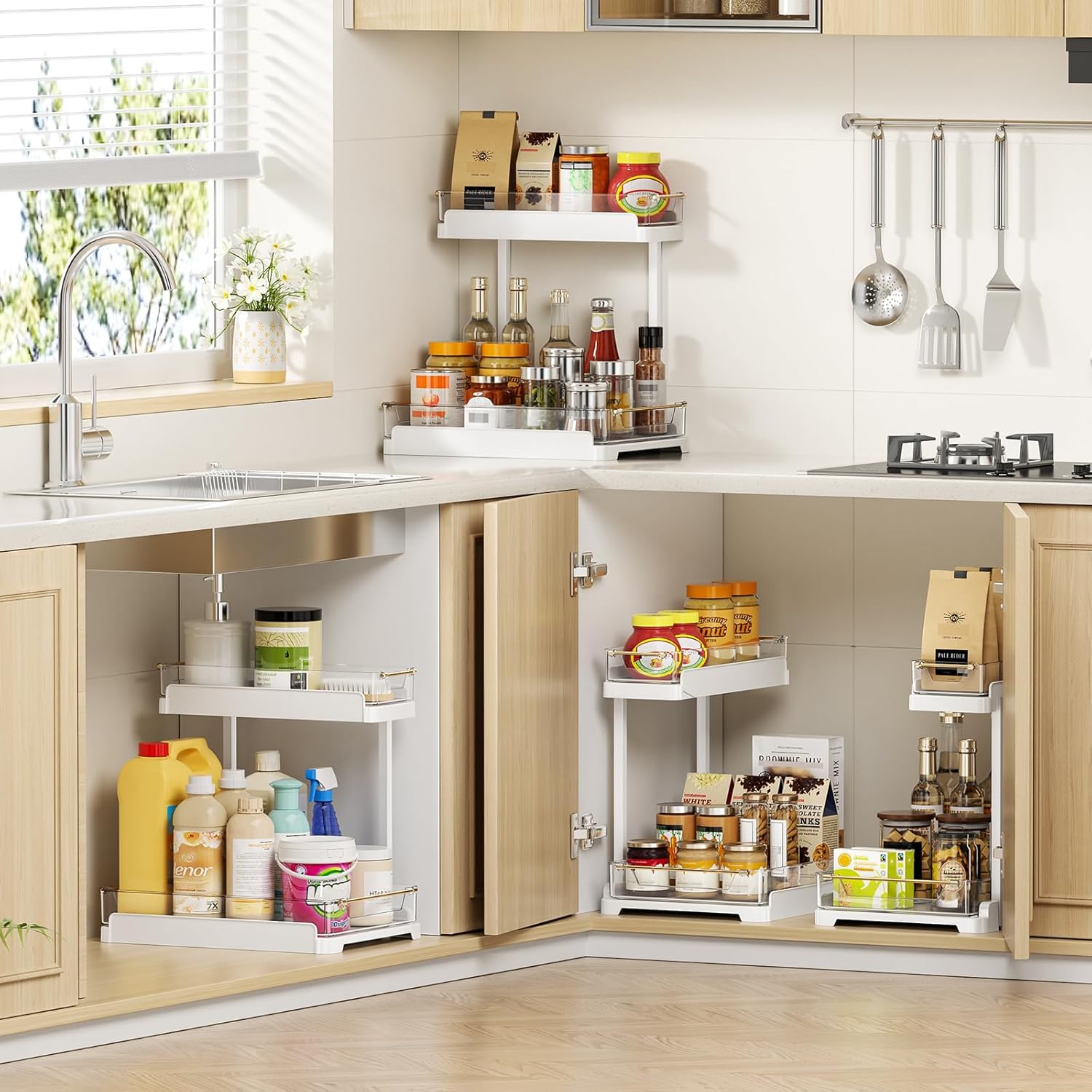 heart & home 2-Pack Under Sink Storage Organizer for Kitchen & Bathroom Cabinets with Removable Washable Tray, Tool-Free Assembly – Multi-Purpose for Countertop, Laundry & Vanity, White