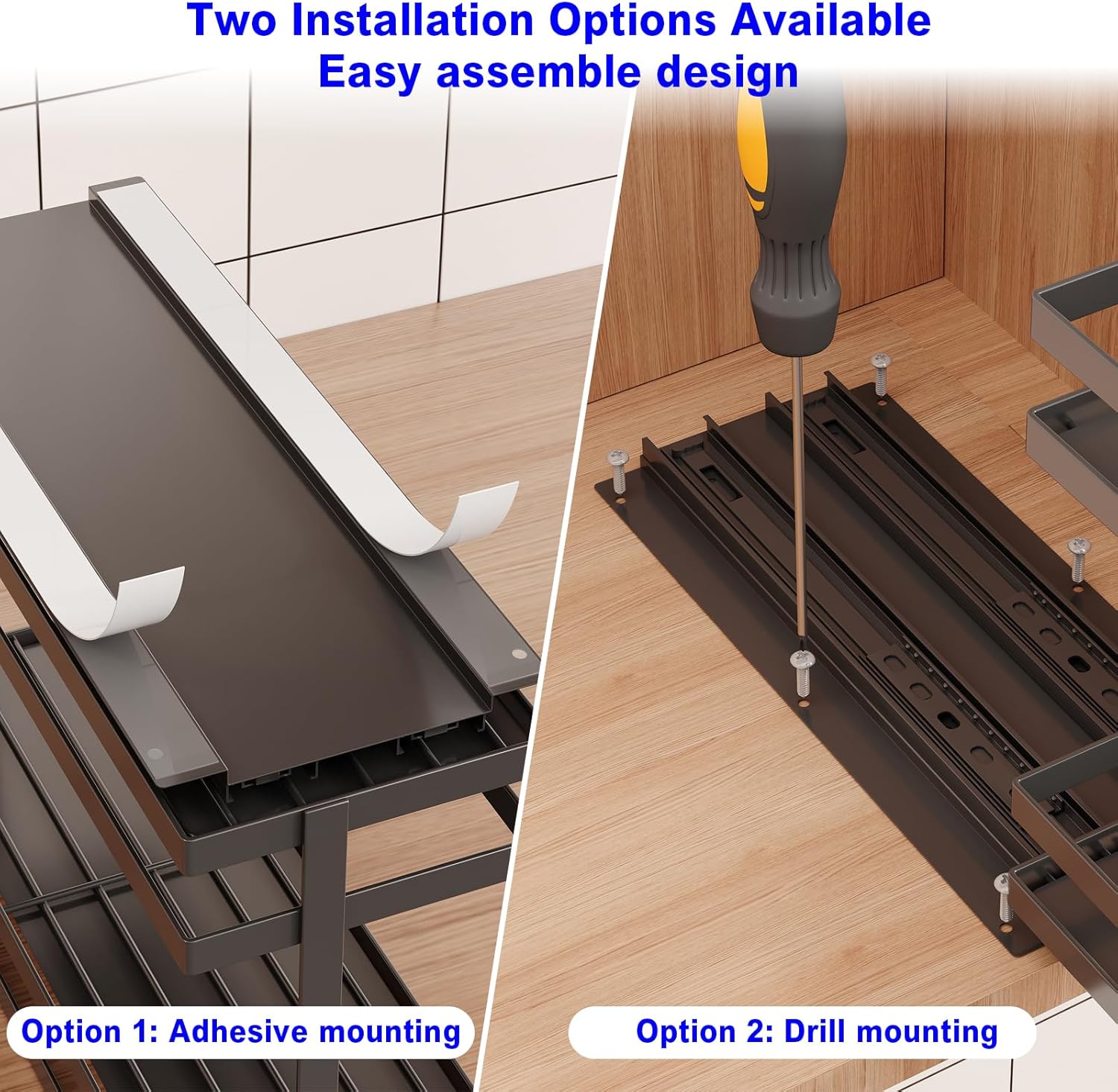- 【Easy to Install & No Assembly】We offer two installation options: 3M Adhesive strips and drilling mounts. With the adhesive strip option, peel off the adhesive film and adhere it to any applicable surface. For those opting for drilling, we provide all the necessary screw accessories. Our products are designed to require no assembly. You can install them directly into your cabinet after opening the package. It only takes one minute to complete.