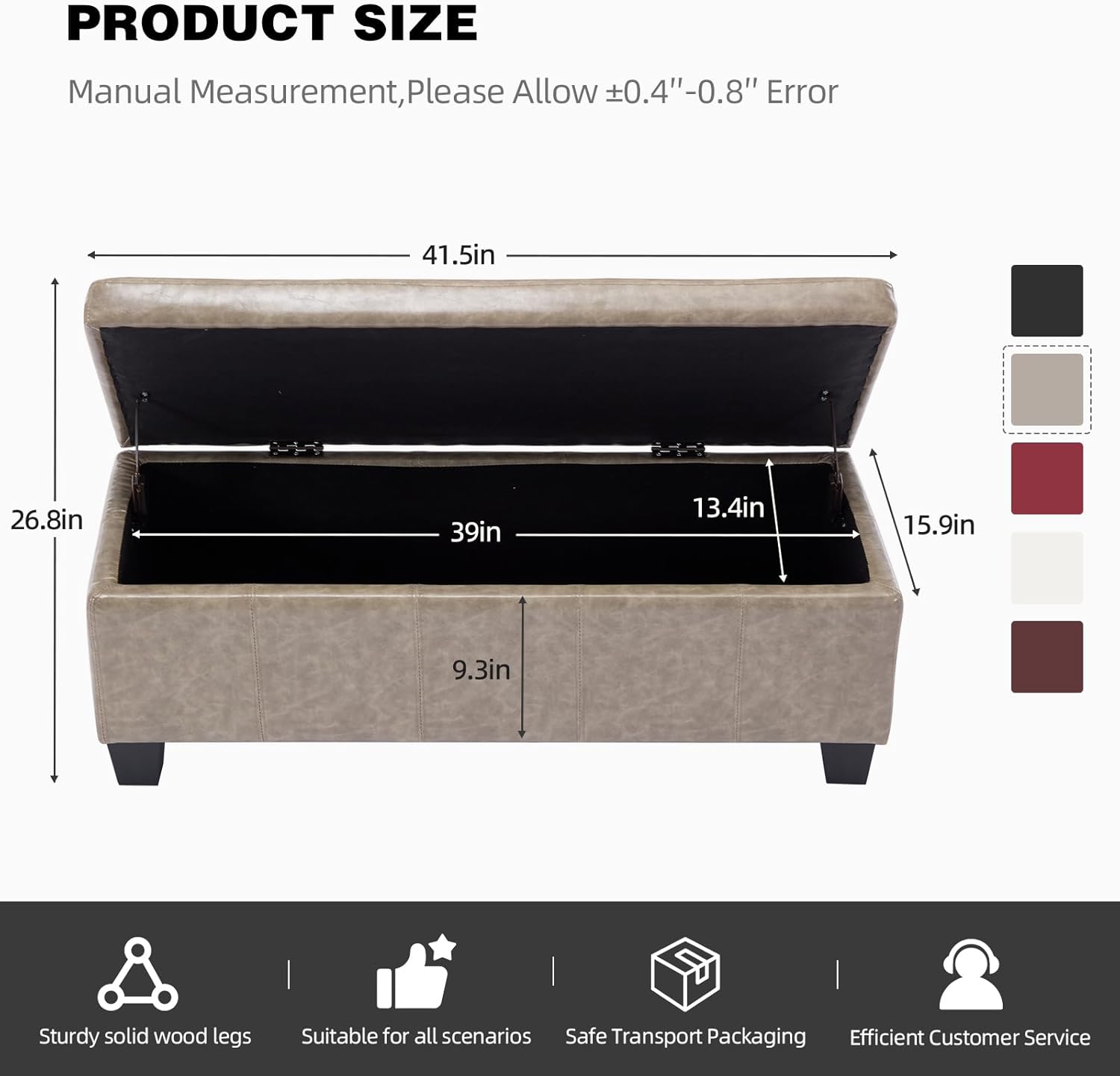 Faux Leather Ottoman with Storage, 42 Inch Rectangular Storage Ottoman Bench with Safety Hinged Lid, Large Upholstered End of Bench for Bedroom Entryway Living Room, Grey