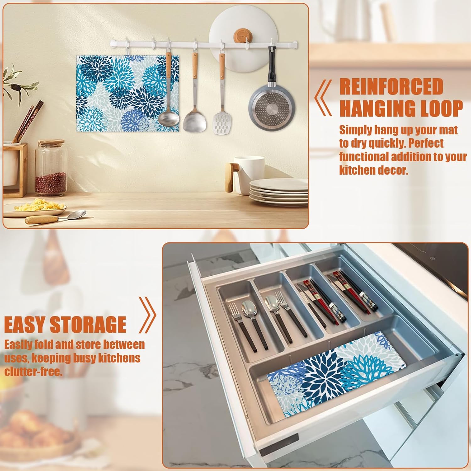Blue Floral Dish Drying Mat for Kitchen Counter Microfiber Absorbent Dish Kitchen Drying Mat Draining Reusable Washable for Dishes/Utensils/Counterto