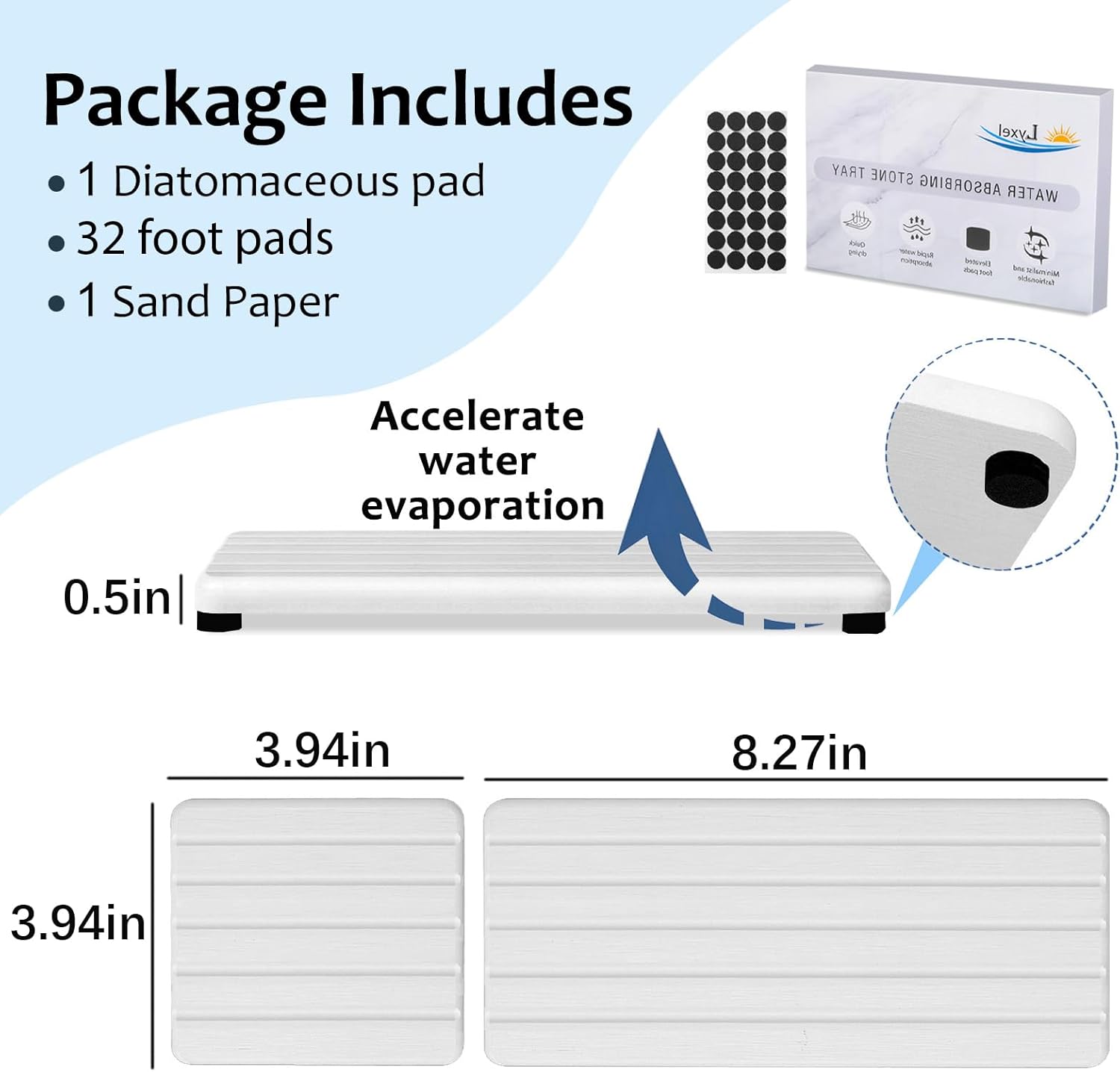 - Perfect Size & 3-pieces --- Our diatomaceous mud coasters are thicker and larger than other products. Packaging Includes: 1 piece pad of 8.27 inches * 3.94 inches * 0.5 inches (21 cm * 10 cm * 1.25 cm); 2 pieces pads of 3.94 inches * 3.94 inches * 0.5 inches (10 cm * 10 cm * 1.25 cm); Silicone anti slip pad * 32; 2 pieces of sandpaper. They can meet your different needs.