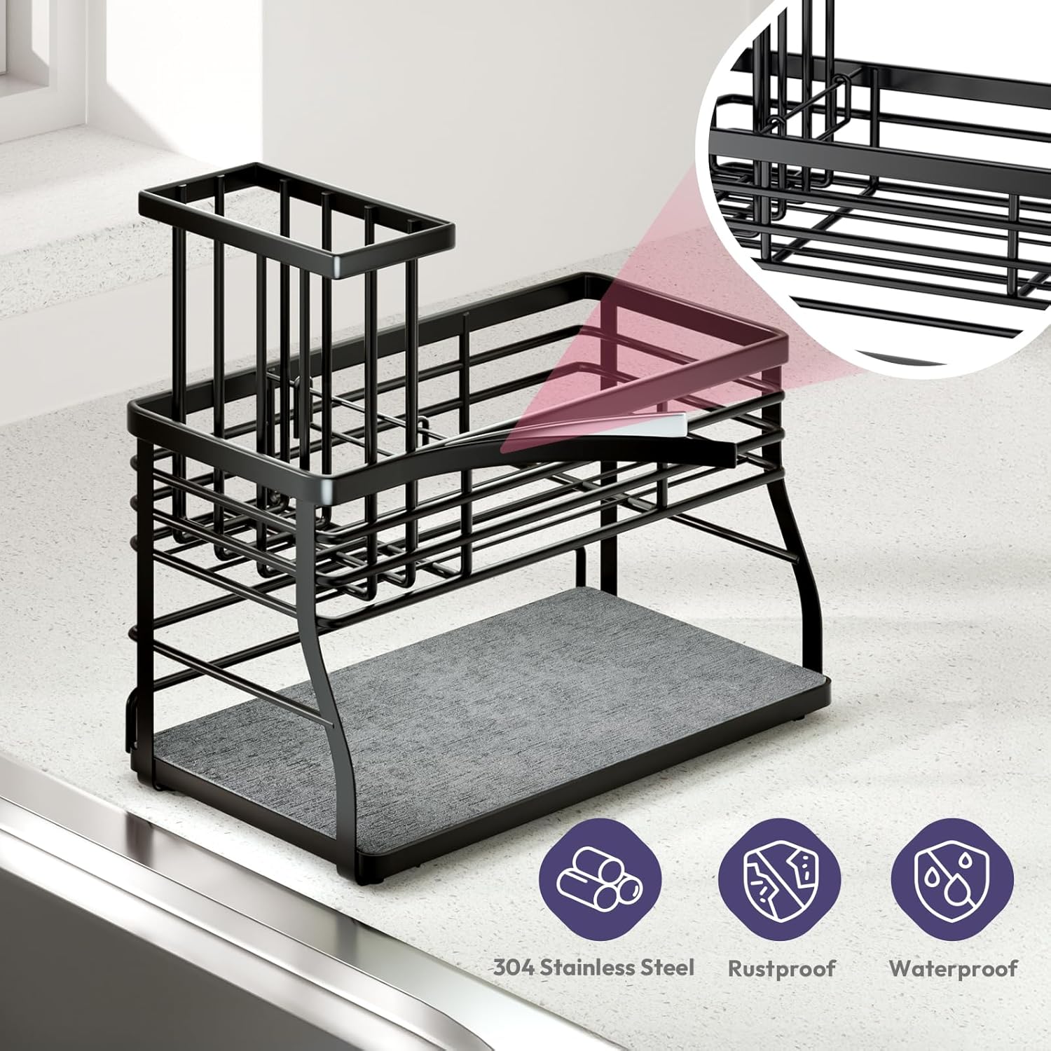 - [Instant Drying with Diatomite Pad] : Unlike typical sink caddy kitchen sink organizer, this sponge holder for kitchen sink features a fast-absorbing diatomite drying pad that eliminates standing water within 60 seconds