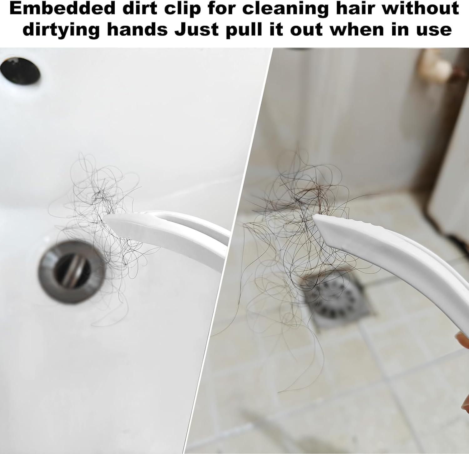 - Embedded stolen goods clip: The handle is embedded with a hidden stolen goods clip that can be pulled out when in use. It is commonly used to clean hair tangled around the drain outlet, such as hand sinks, floor drains, and bathtubs.