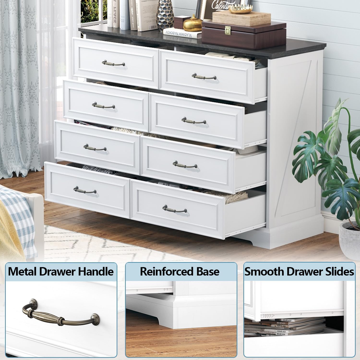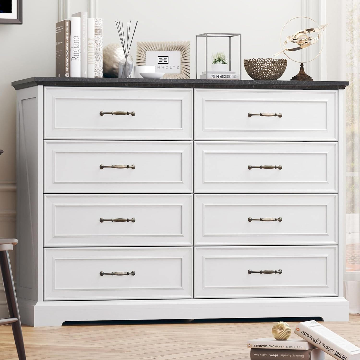 8 Drawer Dresser for Bedroom, 47" Wide Wooden Chest of Drawers, Rustic Farmhouse Dresser with Large Drawers & Metal Handles, Modern Storage Organizer for Closet, Living Room, Hallway, White