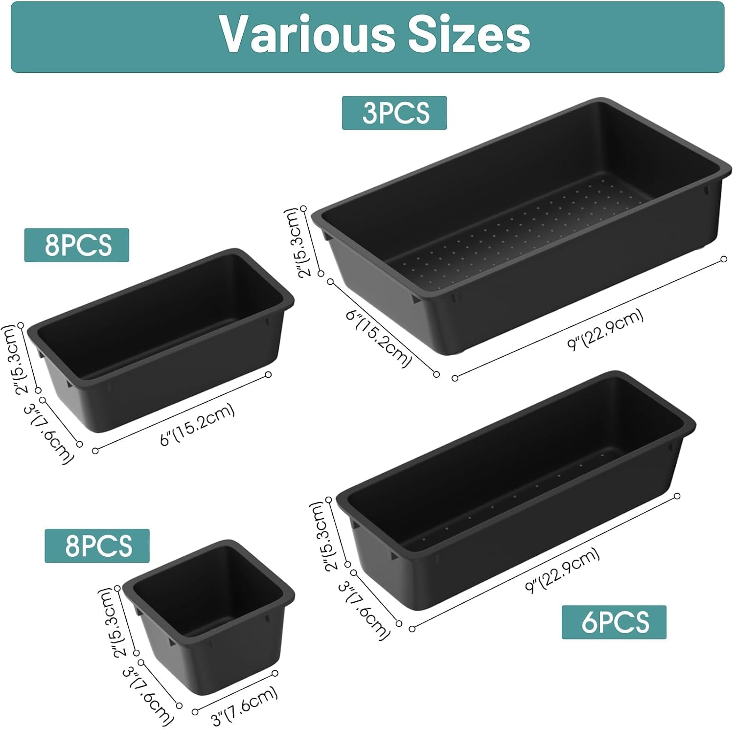 WOWBOX 25 PCS Plastic Drawer Organizer Set, Desk Drawer Divider Organizers and Storage Bins for Makeup, Jewelry, Gadgets for Kitchen, Bedroom, Bathroom, Office, Deep Black