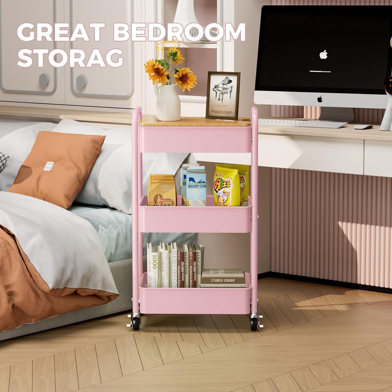 3 Tier Rolling Cart with Table top, Metal Rolling Utility Cart, Sturdy Storage Organizer Cart with Locking Wheels & Hooks for Office, Classroom, Kitchen and Bathroom,Pink