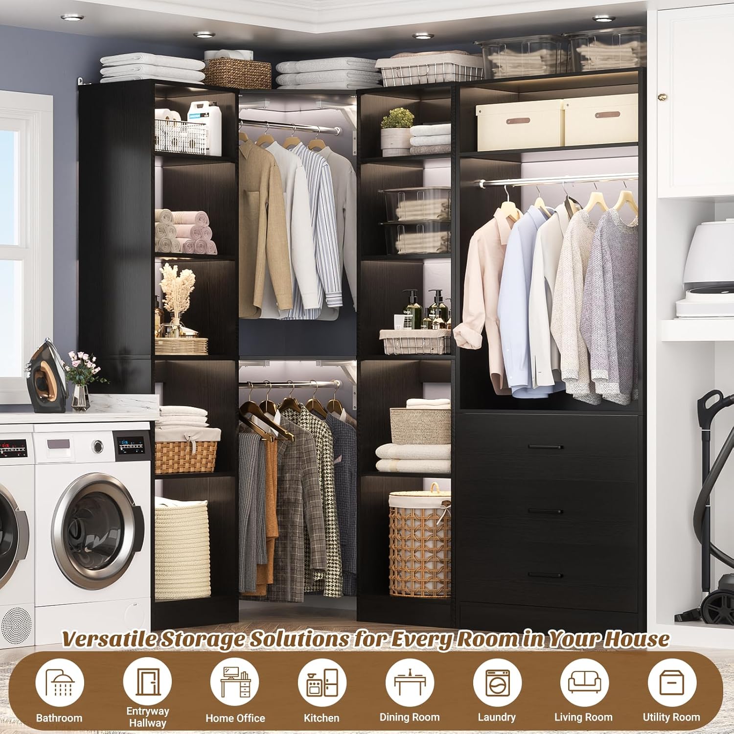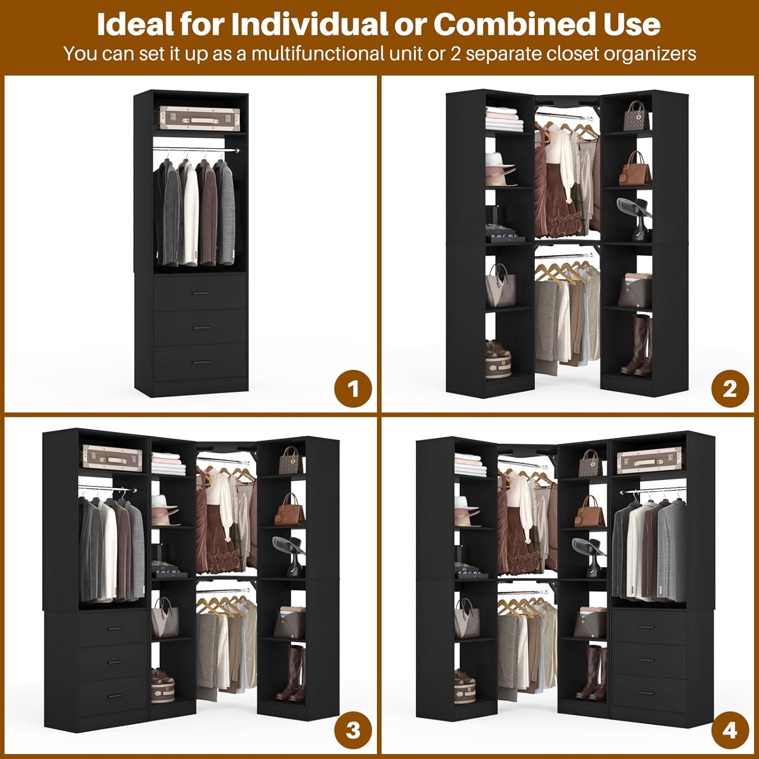 Corner Closet System with 3 Drawers, Corner Closet Organizer System with 13 Shelves & 3 Hanging Rods, 63.2"L * 39.2"W Reversible L Shaped Walk-in Closets, Load 2000+LBS, Black