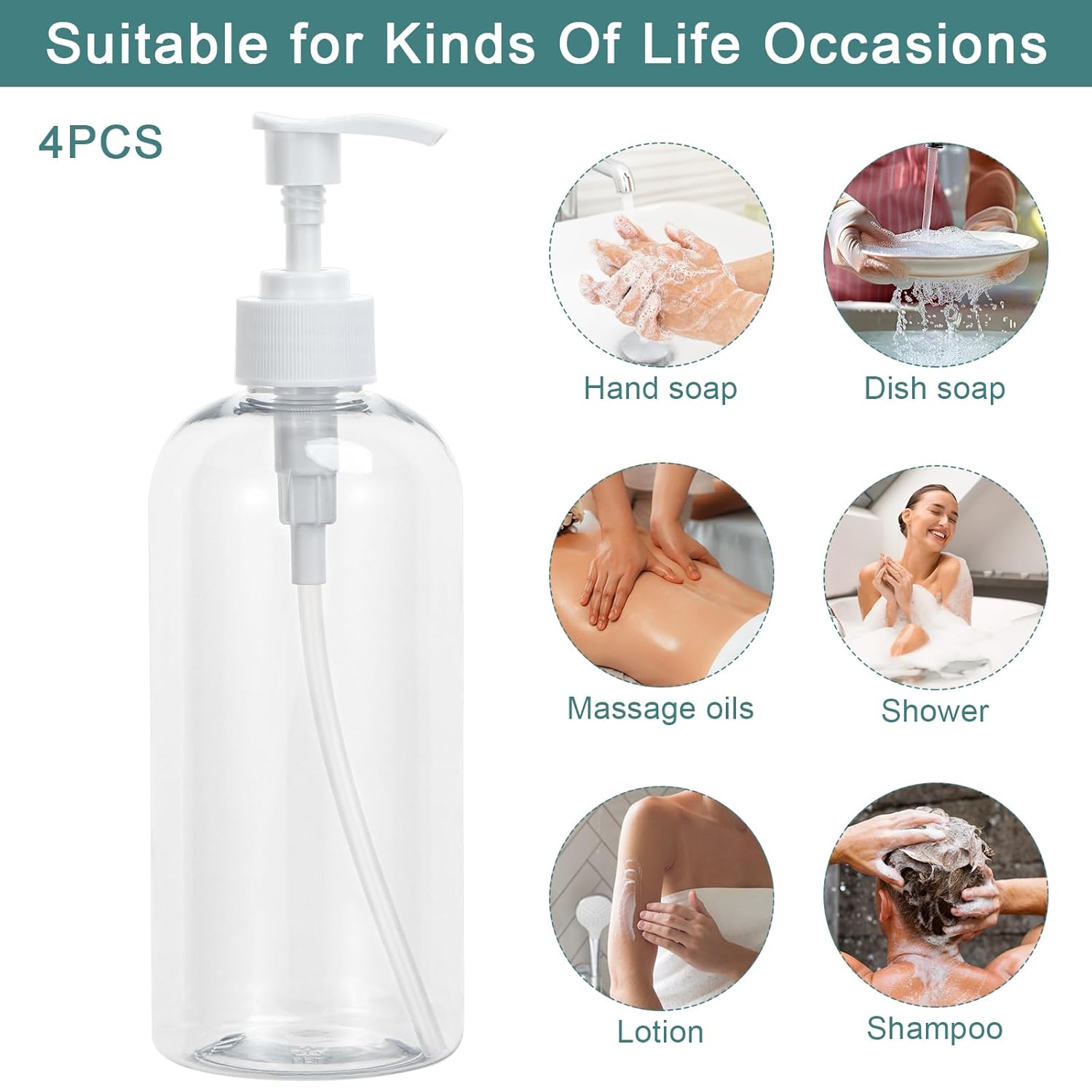 Yebeauty Plastic Pump Bottle, 4 Pack 17oz/500ml Stylish Shampoo Bottles Refillable Hand Soap Dish Soap Dispenser with Press for Massage Oil, Liquid Hand, Clear