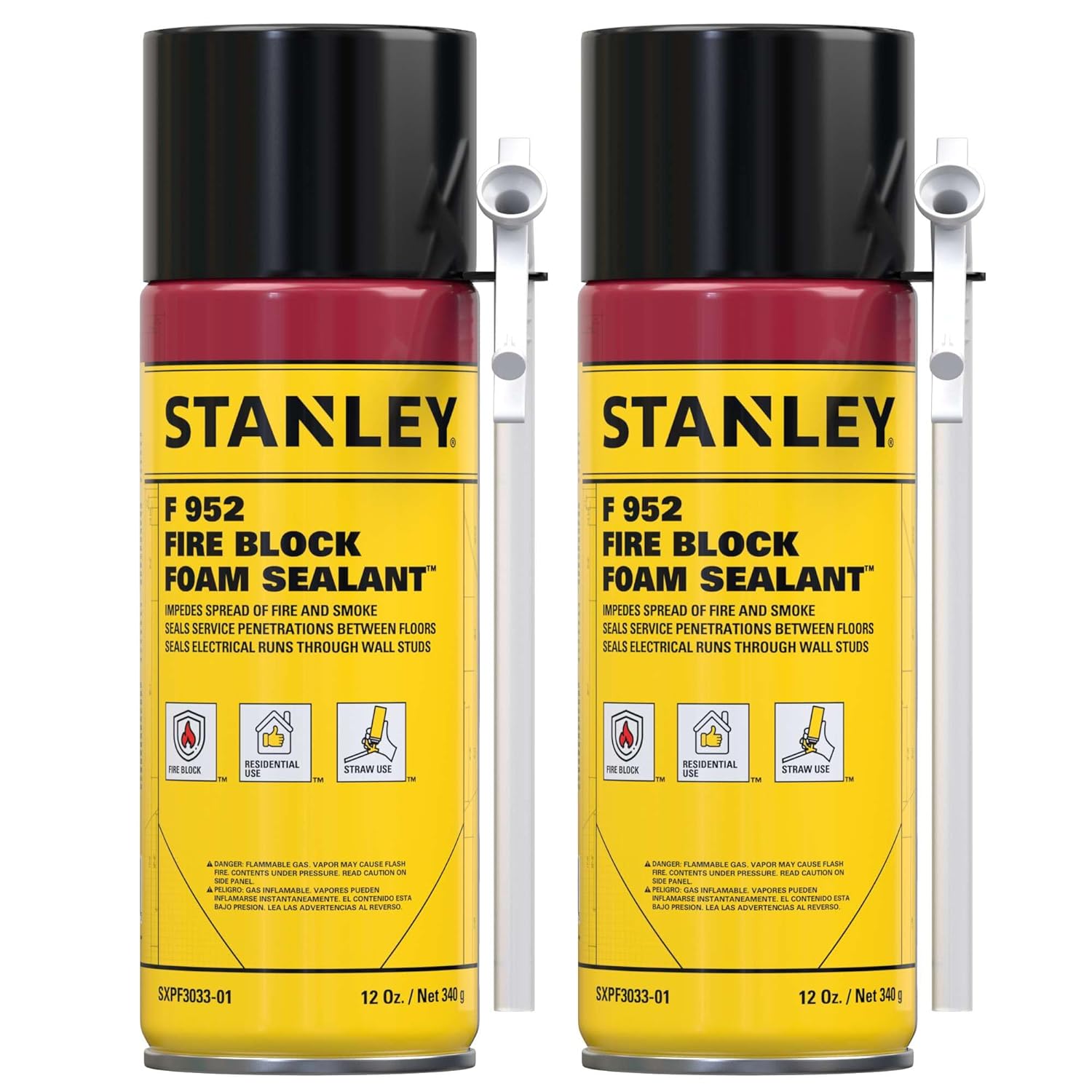 Stanley F952 Fire Block Spray Foam – (2x12oz) Fire Rated Expanding Polyurethane Foam Sealant for Gap Filling & Sealing on Doors, Windows, Walls, Pipes & Joints – Indoor/Outdoor Straw Use | 2 Pack
