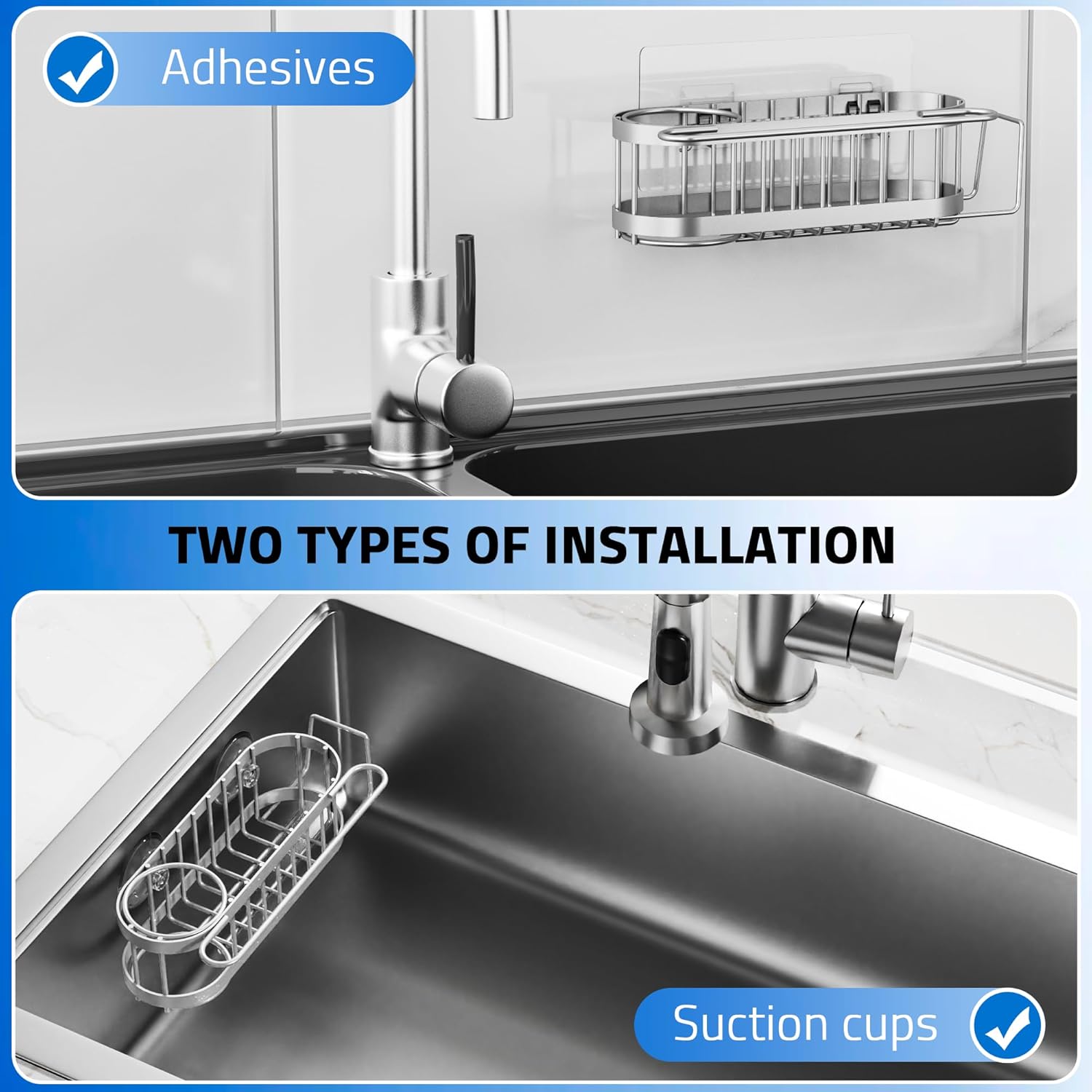 Cisily Grey Kitchen Sink Caddy Sponge Holder in the Sink, Stainless Steel Kitchen Organizer, Brush Holder, Dish Cloth Hanger 2 Installation Ways (Suction & Adhesives