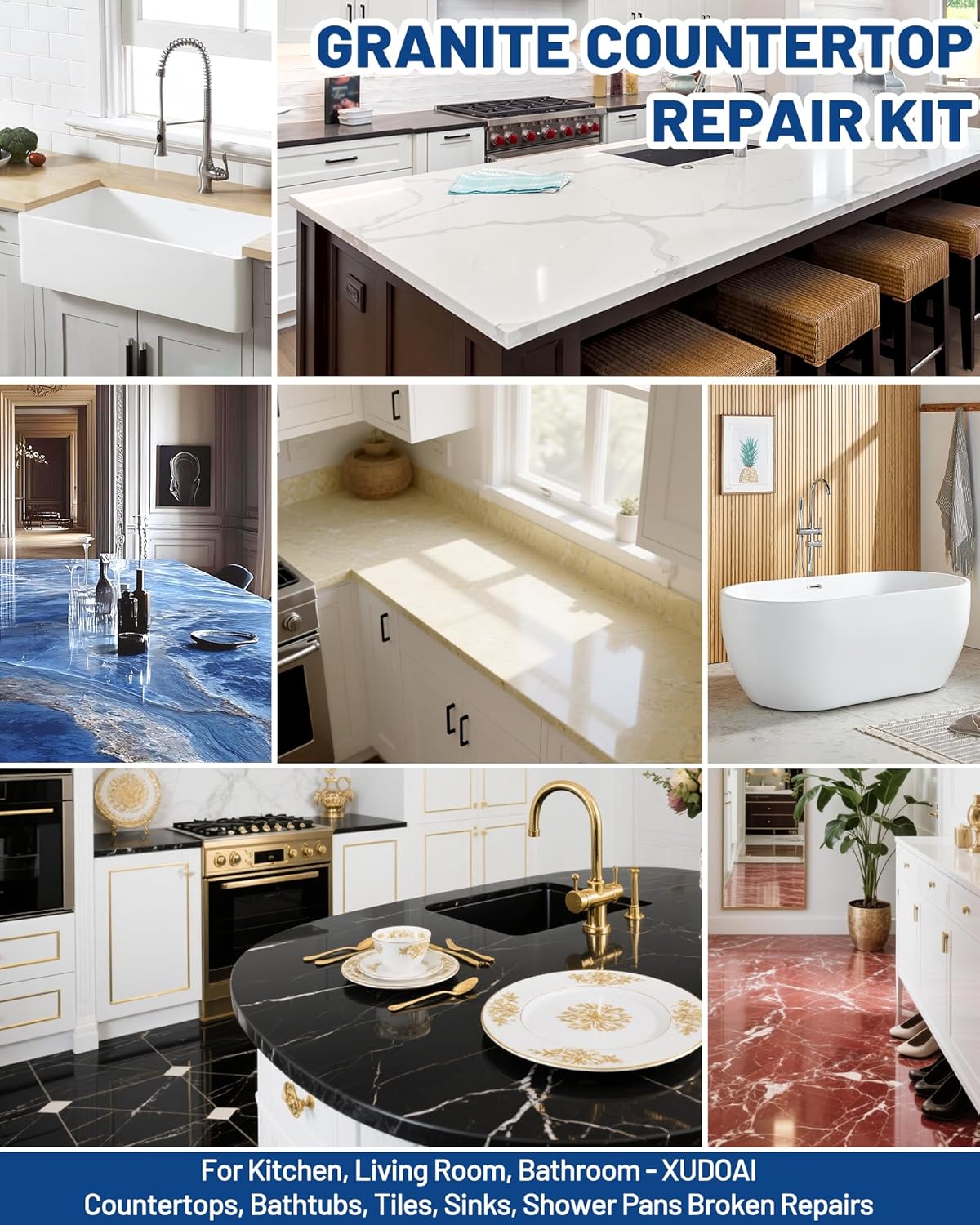 - Tile and Granite Repair Kit Easy to Use: The tools needed for countertop breakage repair are included in the countertop crack repair kit, detailed instructions are provided so that even beginners can easily repair and color match, diy repair. You can restore the flatness and shine of your countertops at home