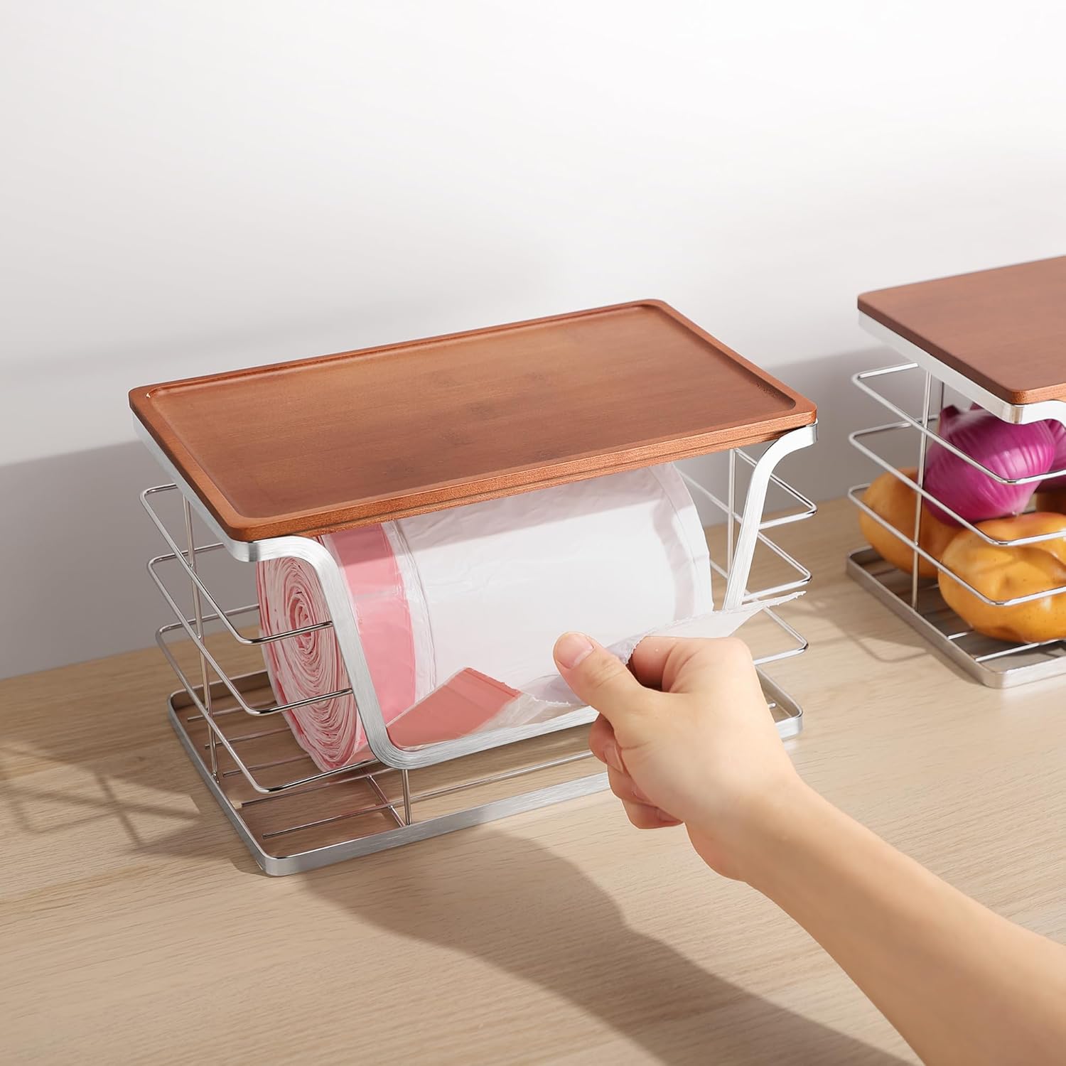 - Stackable Design: The trash bag holder can be stacked vertically to save space to the maximum extent, and the stackable bamboo top can be used to place other items such as bread and snacks. The storage box can be widely used in food storage rooms, under the kitchen sink, or laundry room storage