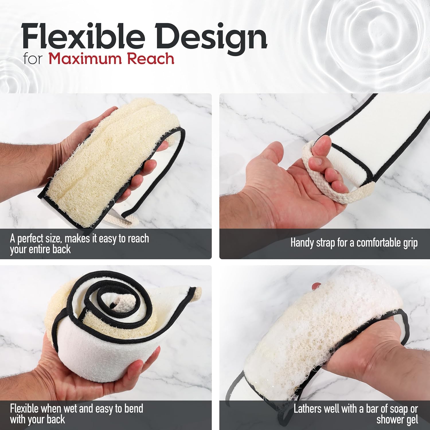 - LIGHTLY ABRASIVE NATURAL LOOFAH FOR A TRULY CLEAN BACK as it leaves your back skin invigorated and more receptive to lotions and moisturizers. The reverse sides have soft terry cloth cotton fabric to remove body oils, dirt and debris.