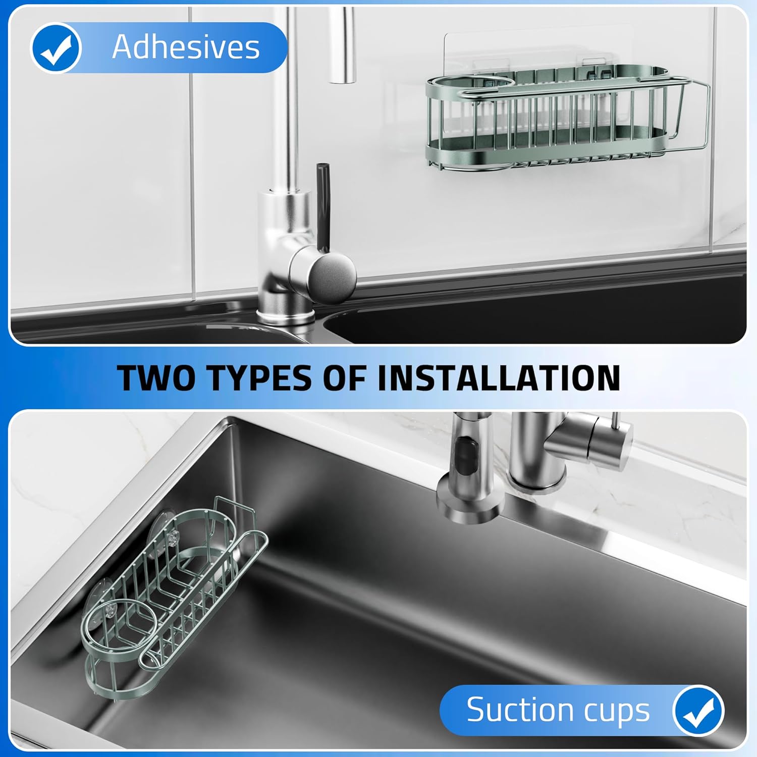 - 【SUCTION CUPS AND ADHESIVE MOUNTING】Cisily sponge holder offers two mounting methods (suction cups or adhesive). It can better meet your various needs for installation location, and can be installed wherever you want. This is a great kitchen accessories!