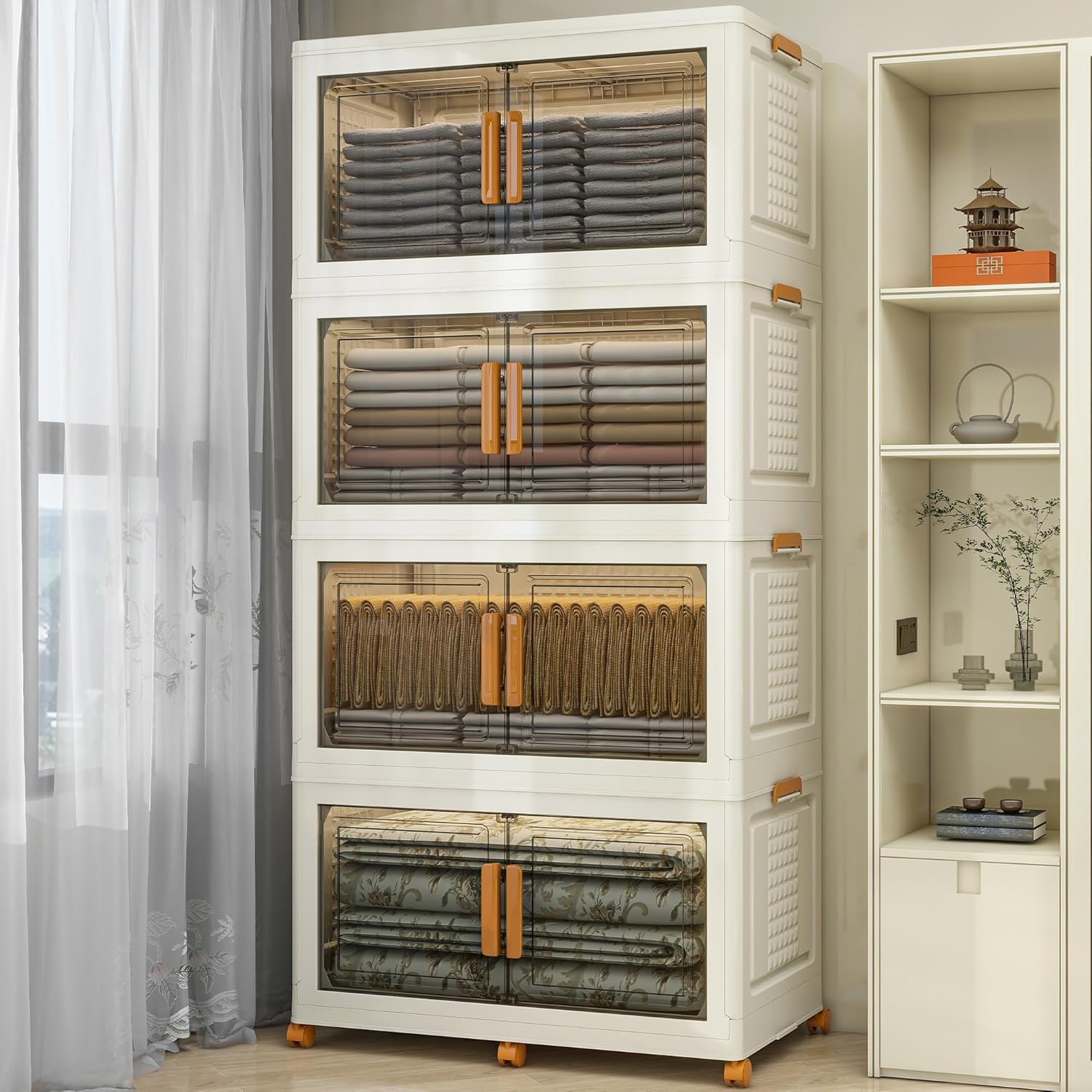 4 Tier Extra Large Stackable Storage Bins with 1 Lid 205 QT/Tier, Collapsible Plastic Box Storage Bin with Wheels, Home Containers Boxes Closet Organizers for Living Room, Office, Dorm