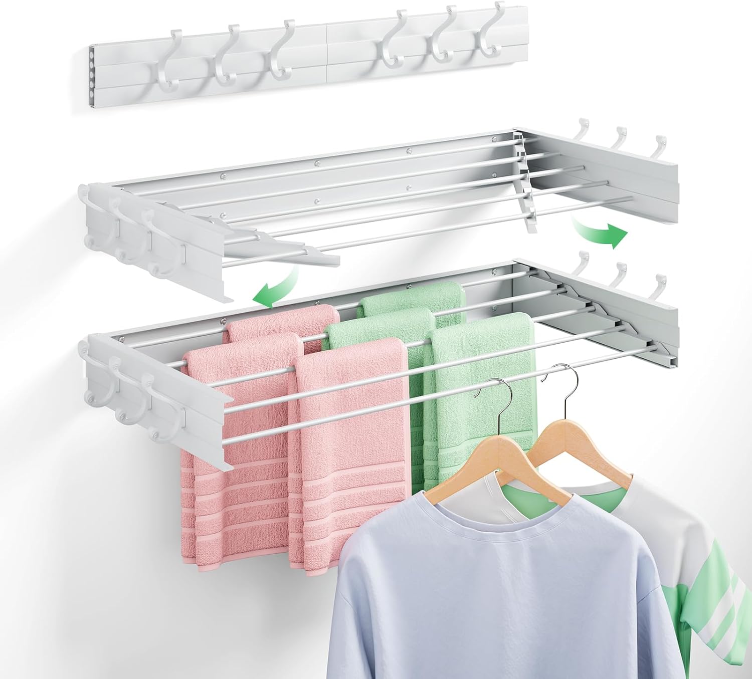 - 【Multiple Hanging Methods】Our added 6 hooks on the side of the wall mount drying racks for laundry, which has the advantage of providing extra hanging space, and the hooks can also hang anything when in folded state, which makes this drying rack wall mounted a good choice for limited space.