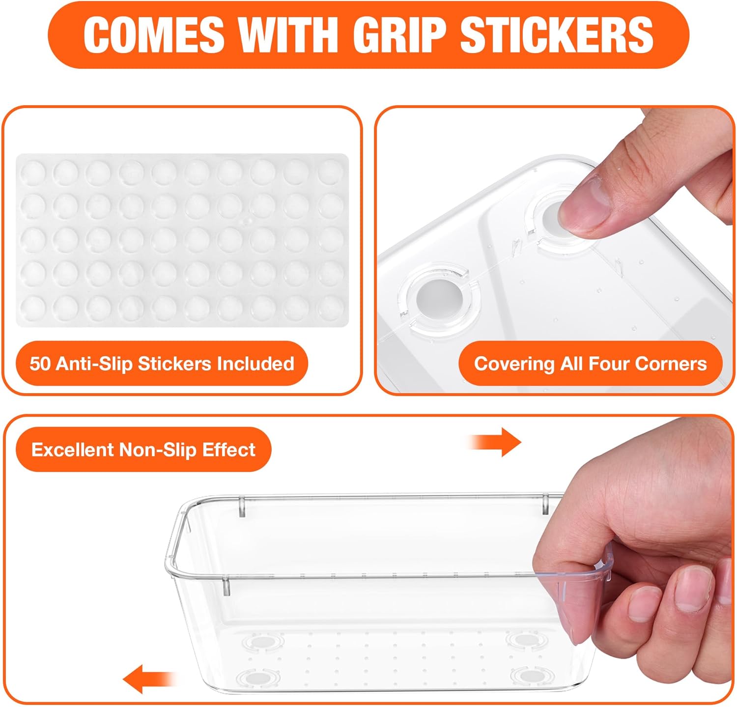 - Anti-Slip Design: Our bathroom drawer organizers have anti-slip spots inside and come with 50 anti-slip stickers that can be applied to the four corners of the base. Whether opening or closing the drawer, the plastic drawer organizers stay firmly in place