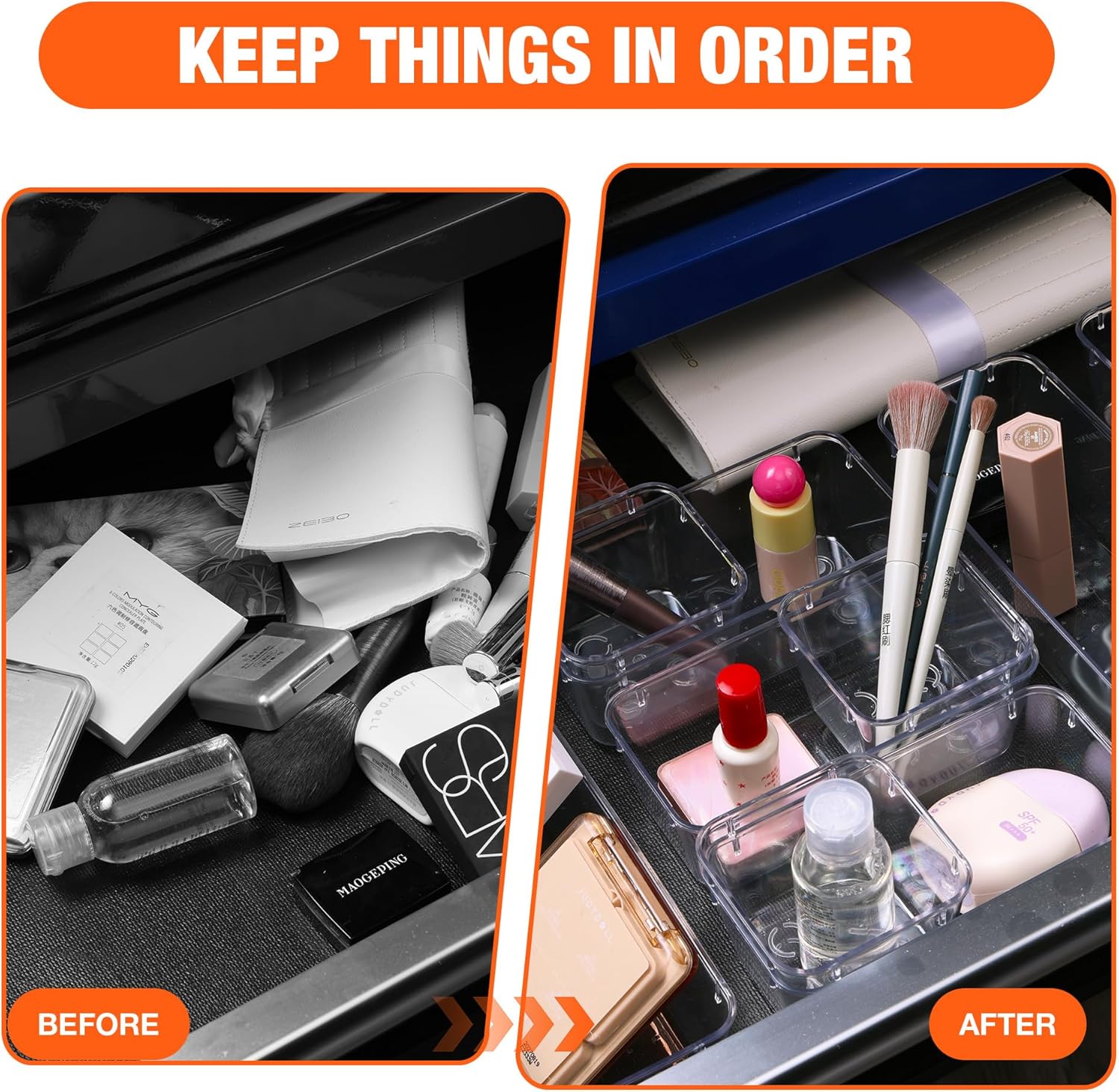 - High-Definition & Easy to Clean: Made of premium PET plastic, these vanity drawer organizers offer exceptional durability and crystal-clear visibility. No more rummaging—quickly identify contents at a glance. Simply wipe the surface clean to remove dust with ease