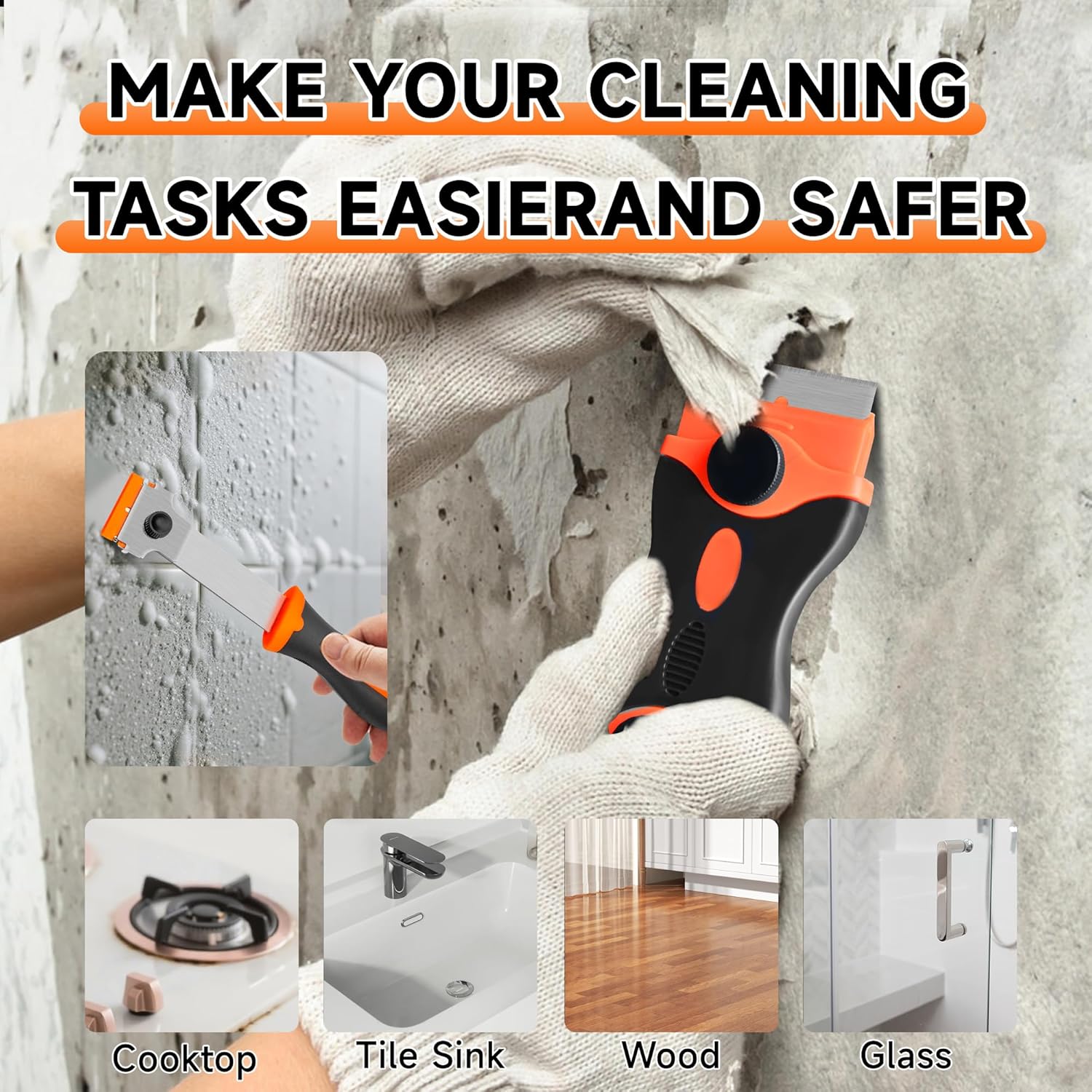 - 【Proven Double-edged Plastic Scraper】 Experience effortless cleaning with our double-end plastic razor blades, designed for versatility in various cleaning tasks. .Compact and easy to grip, our ergonomic paint scraper features a soft rubber handle for comfort and control. The heavy-duty non-slip TPR handle ensures durability and a cushioned grip, while the double-secure safety cap protects against accidental cuts. Plus, the screw lock keeps the blade stable during use, saving you time and effort.