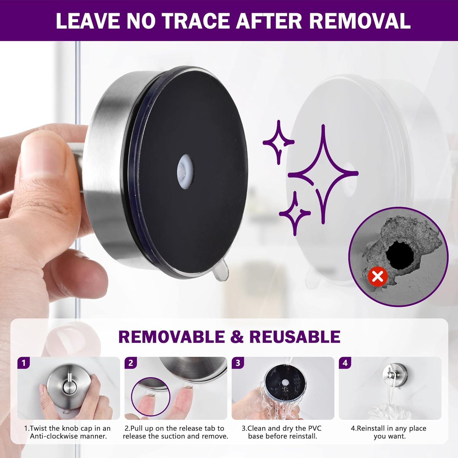 JOMOLA Brushed Stainless Steel Shower & Bathroom Hooks - No Drill Adhesive-Free Suction Cup Hardware, Rustproof Waterproof Metal Wall Mount for Towel Robe, Damage-Free (4-Pack)