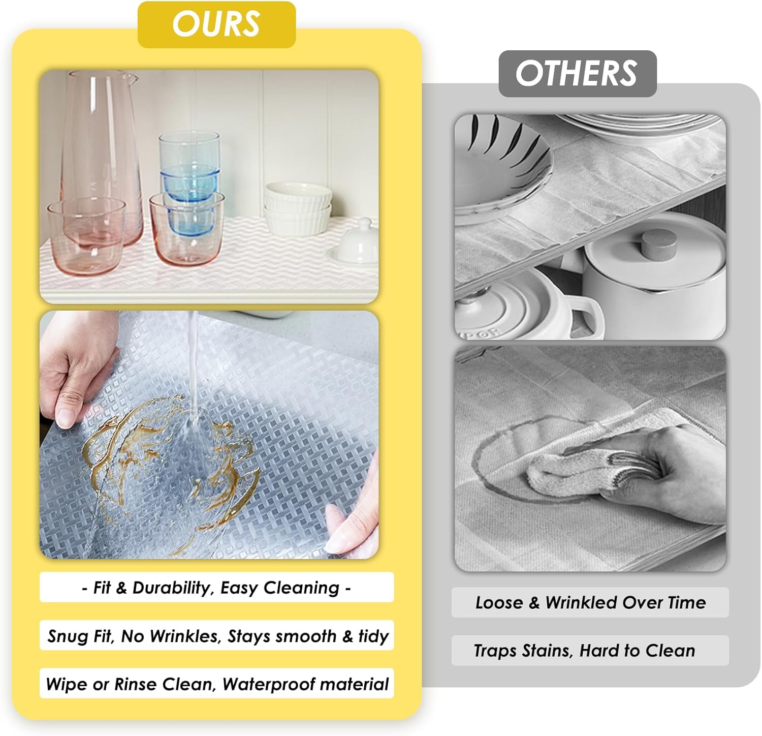 - ✅ Waterproof Drawer Liner – Anti-Slip & Easy to Clean! Secure Grip + Effortless Maintenance – The textured shelf and drawer liner prevents items from sliding, even when opening or closing. Waterproof surface wipes clean instantly with a cloth or rinses under water – no stains, no fuss. Perfect for shelf liners for cabinets that stays pristine!
