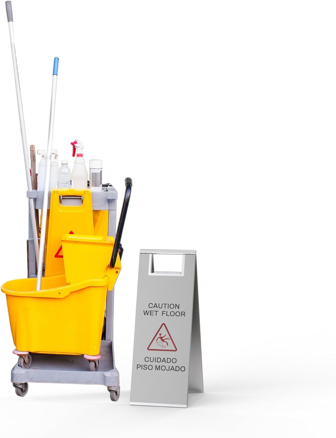 Stainless Steel Wet Floor Sign 2 Pack, 24 Inch Double-Sided Foldable Caution Sign with Handle, 8.8 lb Bilingual Warning for Restaurant, Office, Commercial Cleaning Use, Silver