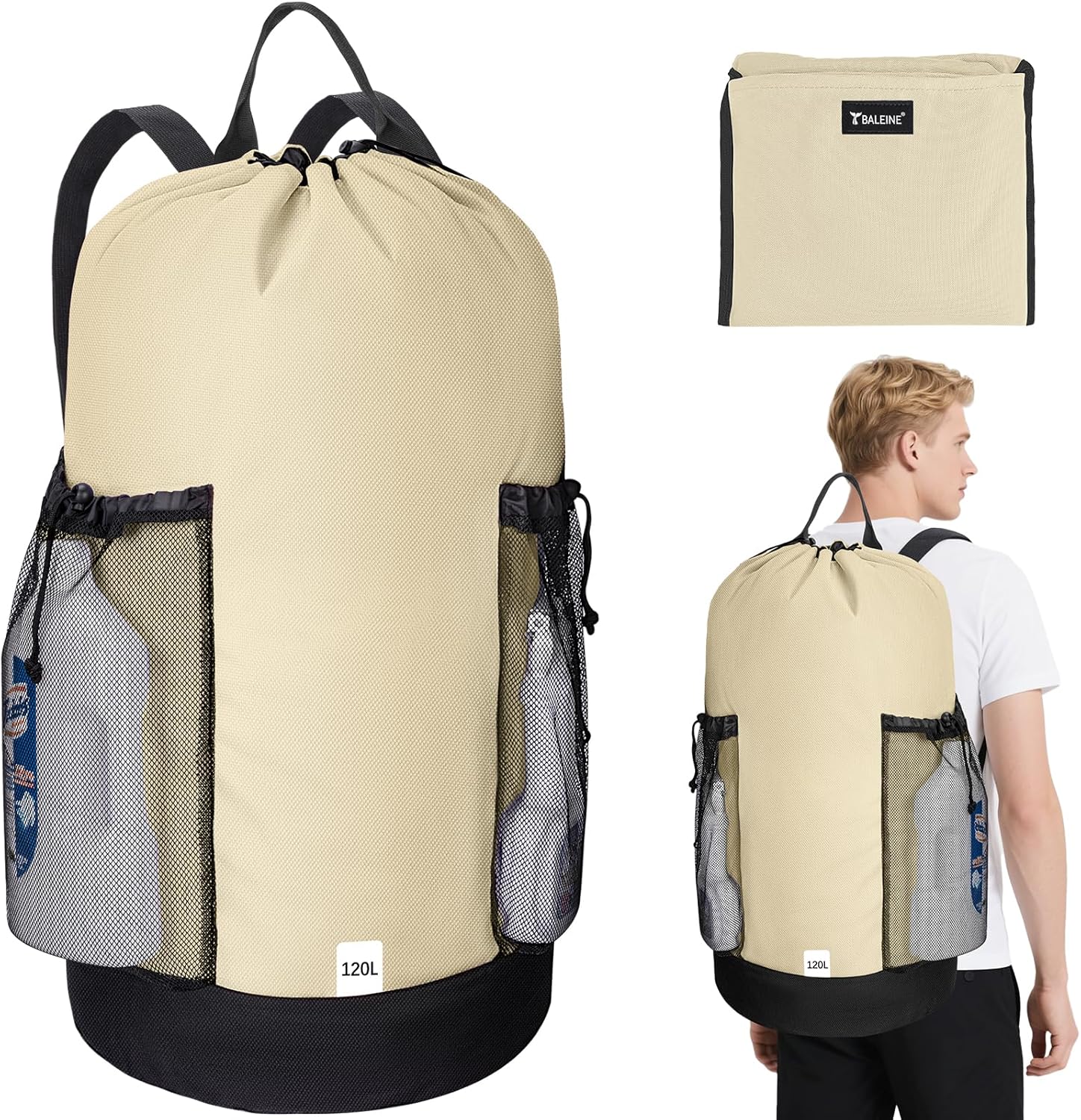 BALEINE 120L Laundry Bag Backpack, 900D Oxford Fabric Large Travel Laundry Bags with Shoulder Straps and 2 Mesh Pockets for College Dorm, Apartment, Laundromat (Beige, 120L)