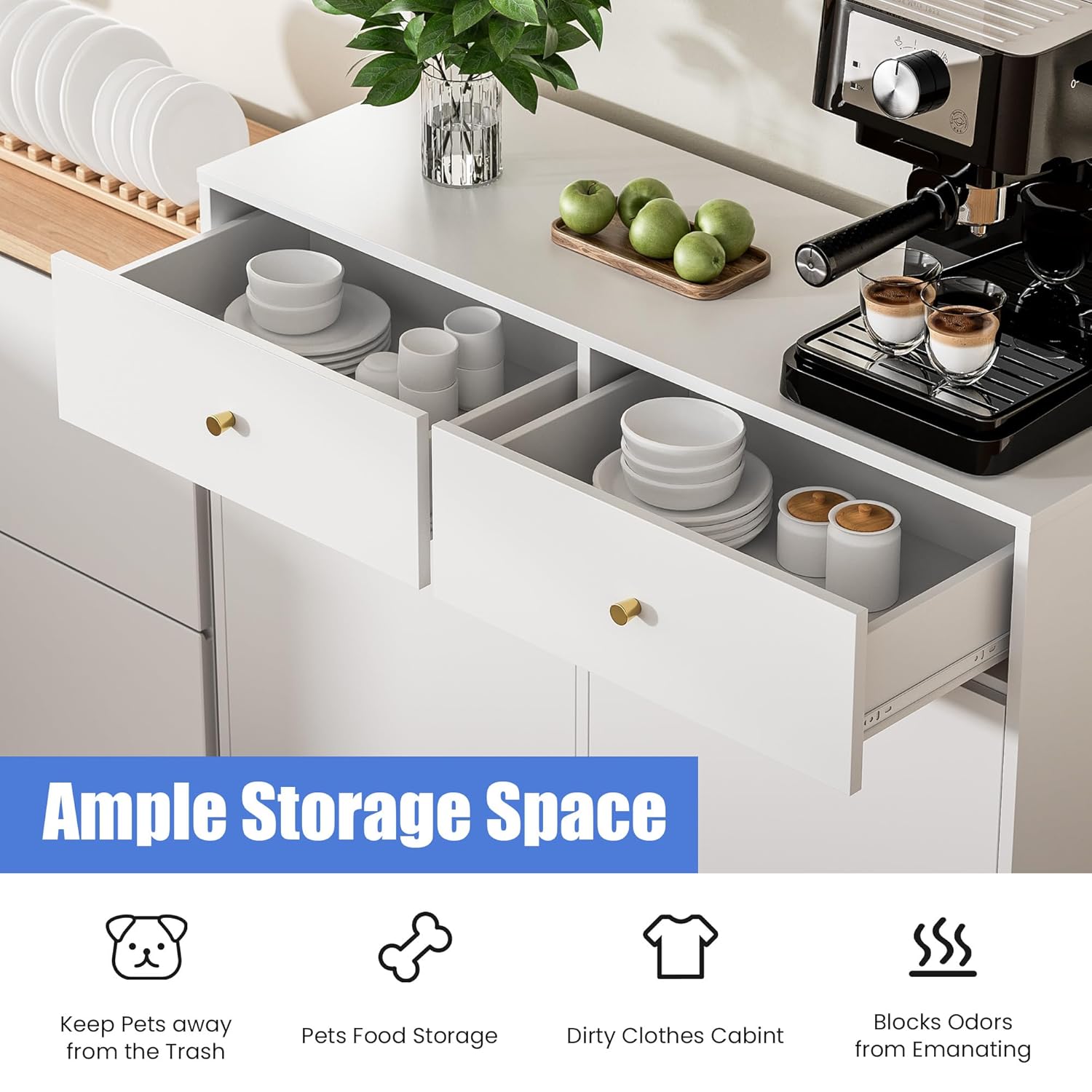 Double Tilt Out Trash Can Cabinet with 2 Drawers, Trash Storage Cabinet, Hidden Garbage Bin, Free Standing Laundry Sorter Organizer for Kitchen Dining Living Room, Bathroom, White
