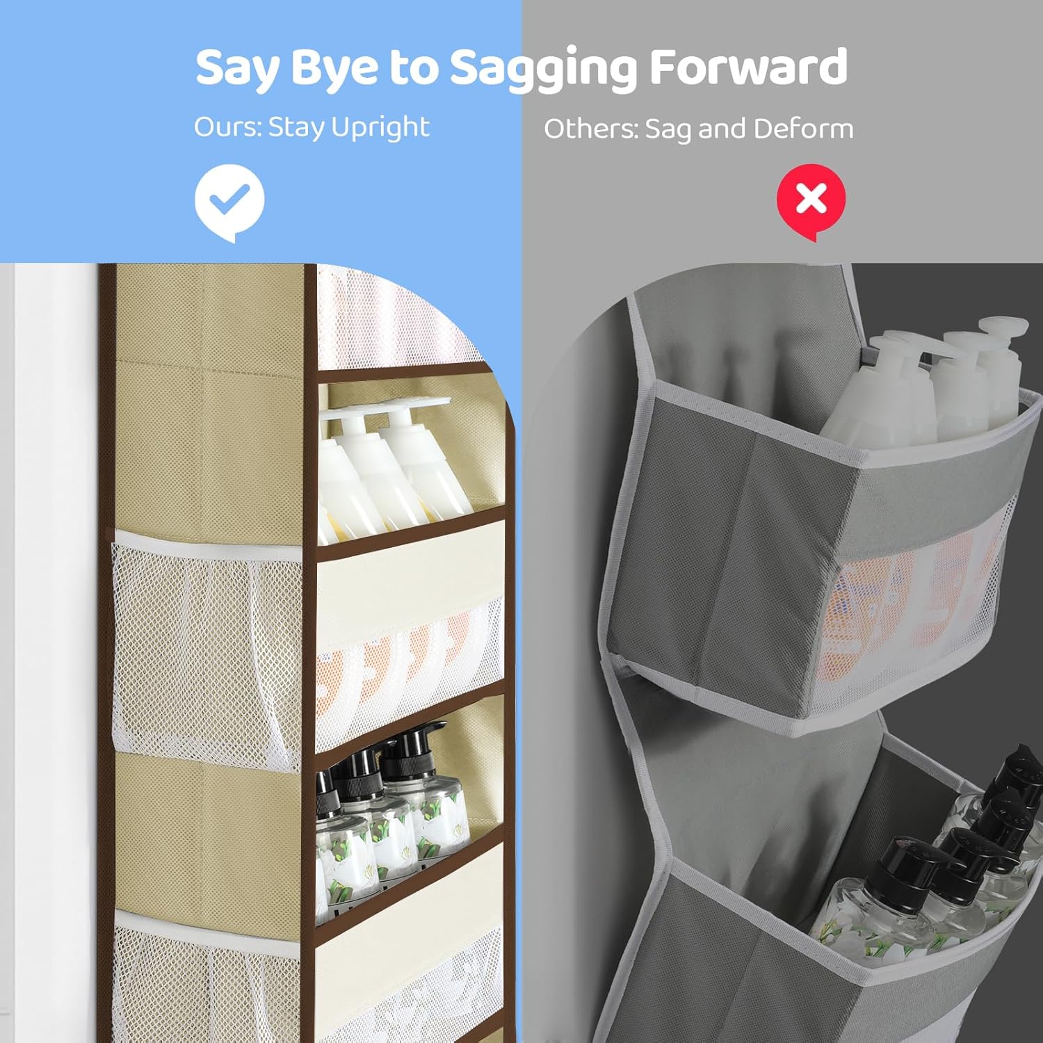 - Say Goodbye to Tilting: Our new design of over the door organizer boasts stitched side seams, which ensures a high load-bearing capacity of up to 35.2 lbs, keeping the door hanging organizer upright and sturdy even when carrying heavy items. With spring hooks that fit most standard doors less than 1.65in thick, it securely fastens the door for smooth opening and closing without sliding or swaying
