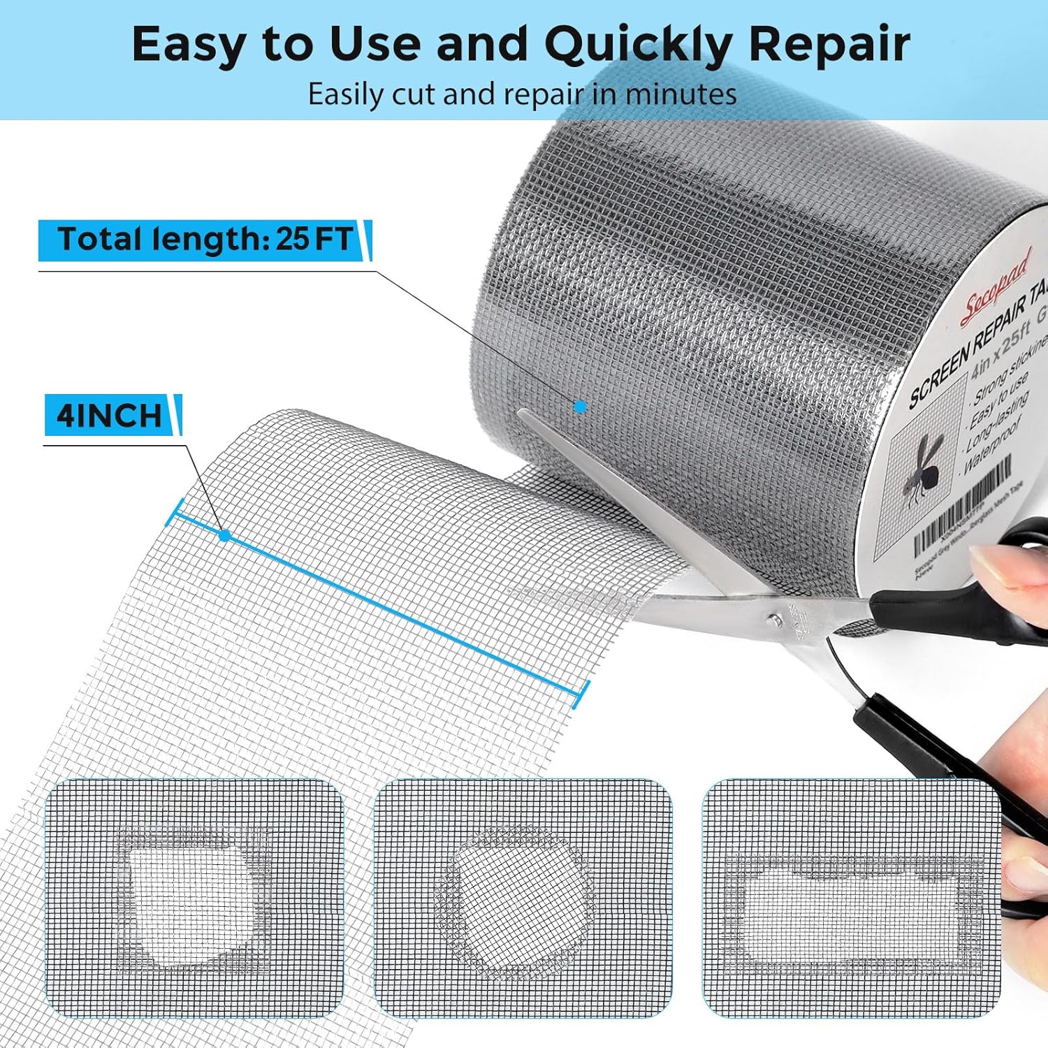 - Extra long and Save money: The size of the screen repair tape is 4IN X 25FT, you can use more of them to repair a larger hole. No need to spend a lot to replace the entire screen mesh then