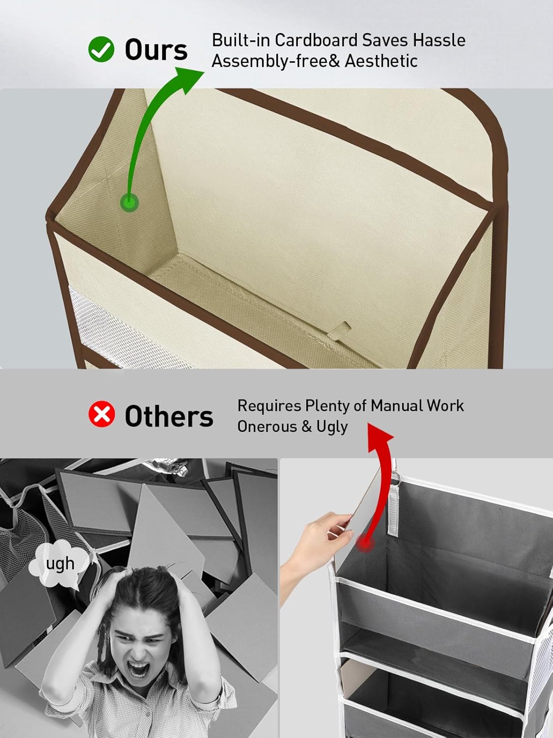 - Easy Assembly, No Hassle: Unlike other brands' door hanging organizer bedroom that comes with piles of cardboard that need complicated manual assembly, Our over the door storage comes pre-inserted with cardboard in the pockets, giving you a tool-free assembly within seconds. Simply hang the hooks over the door, then hang the over door storage, insert 5 cardboard bottoms, and you're ready to go