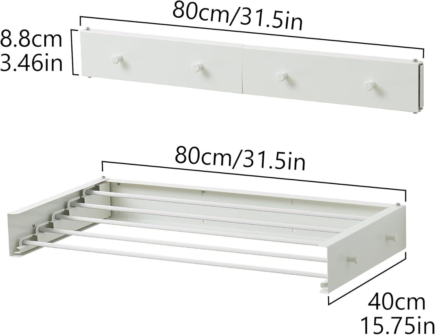 Clothes Drying Rack,Laundry Hanging Rack Collapsible,Wall Mounted Drying Rack for Laundry,Foldable Drying Rack Indoor Outdoor,31.5" Wide,5 Aluminum Rods with Hooks, 60 lb Capacity (White 31.5" Hooks)