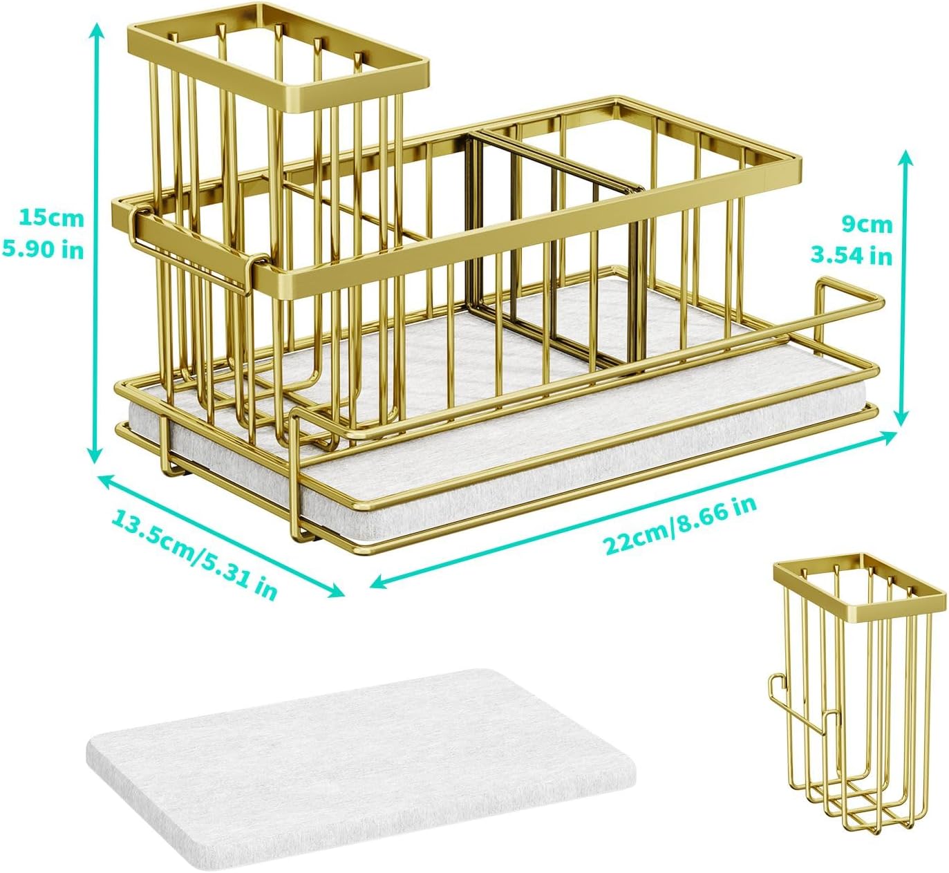 HapiRm Sink Caddy Sponge Holder - Kitchen Sink Organizer with Instant Drying Stone and Brush Holder, Stainless Steel Sponge Caddy for Kitchen Countertop - Gold