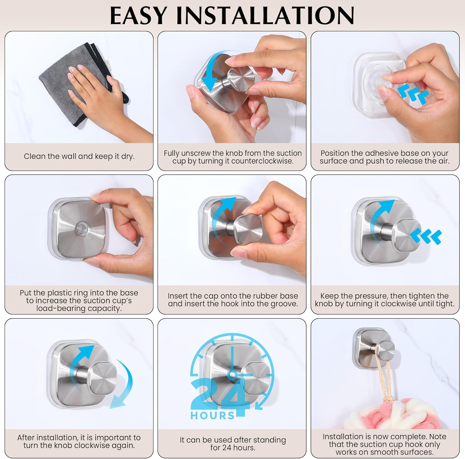 - 1:Shower Suction Hooks - No Drill Install Quick-install suction shower hooks for shower walls/glass. Bathroom hooks function as no drill towel hooks for bathroom, securely hanging towels & robes. Avoid: CERAMIC, POROUS MARBLE, PAINTED WALL, FROSTED GLASS, WALL PAPER, MOSAIC, GRANITE! Ideal bathroom hooks for shower areas.