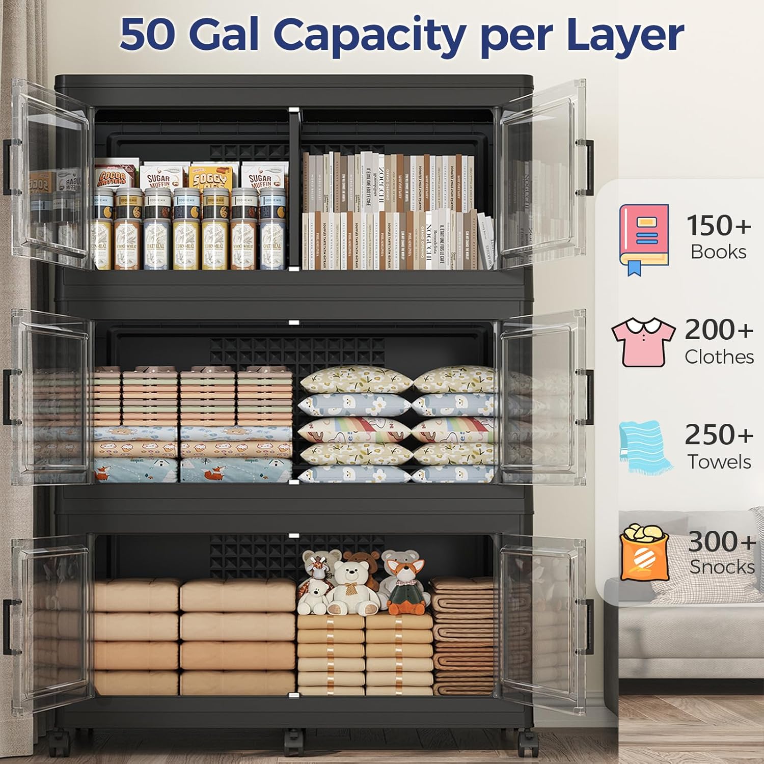 - 【150 Gal Extra Large Storage Bins with Dividers】Our Qavabin black storage cabinet with lid boasts an impressive 50-gallon capacity per tier, totaling 150 gallons across 3 tiers. This foldable storage bins with doors and wheels expands to 31.5''Lx18''Wx47.5''H and supports a maximum weight of 110lb. Each tier includes a divider, allowing for the creation of two separate compartments on one level. PLEASE NOTE: ONLY ONE LID PER SET!!!