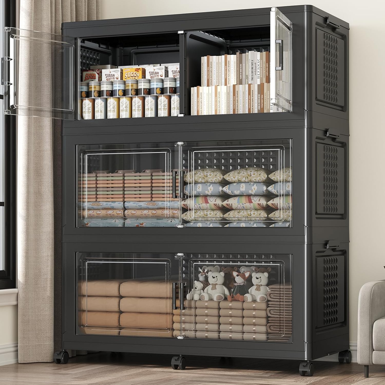 - 【Two Ways to Open & Clear Magnetic Door】The collapsible storage bins with lids and wheels feature a dual access way, allowing for both top and front door openings, and with clear windows for easy visibility. The stackable plastic storage bins with open front doors are equipped with magnetic lock buckles to prevent dust from entering the cabinet.