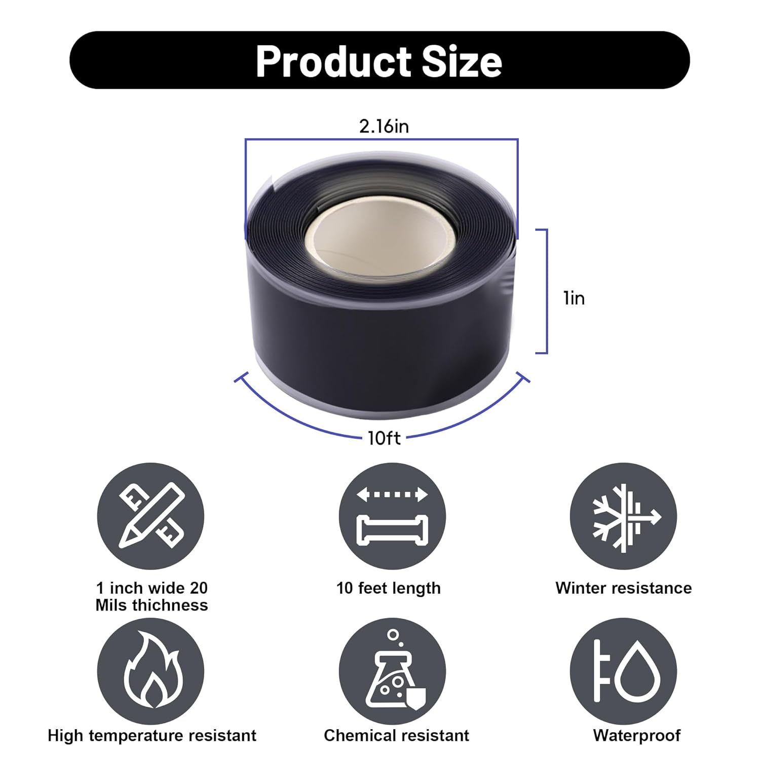 Self Fusing Silicone Tape 2 Rolls 1 in x 10' Black Waterproof Rescue Tape Rubber Leak Silicone Self-amalgamating Tape for Plumbing, Sealing Pipes, Hose Repair, Outdoor Coax and Tool Fixation