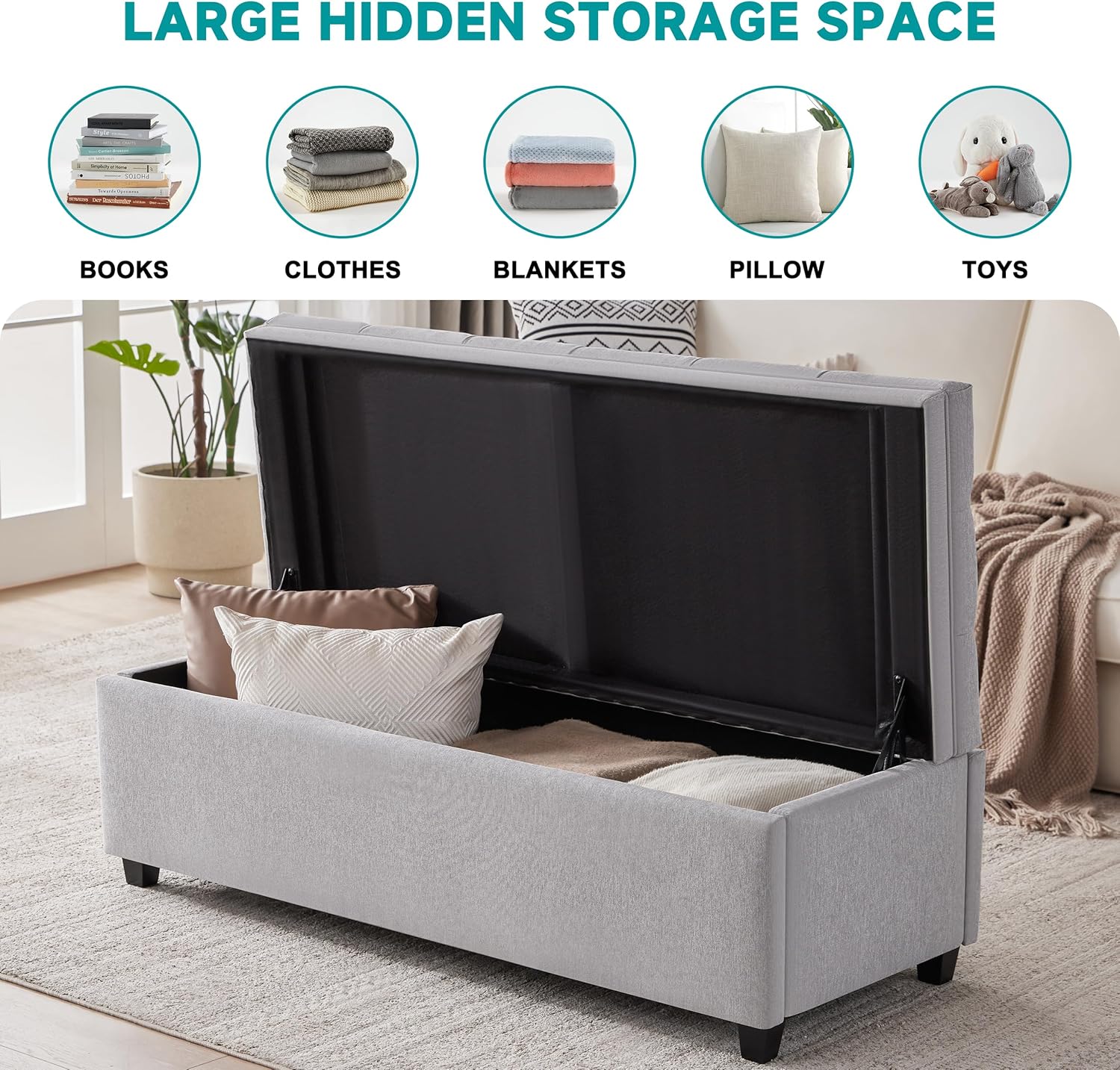 - Large Hidden Storage: Keep your space tidy with easy and quick access to stored items. The spacious interior of the large storage ottoman bench for bedroom provides ample room to organize blankets, clothes, shoes, helping you eliminate clutter