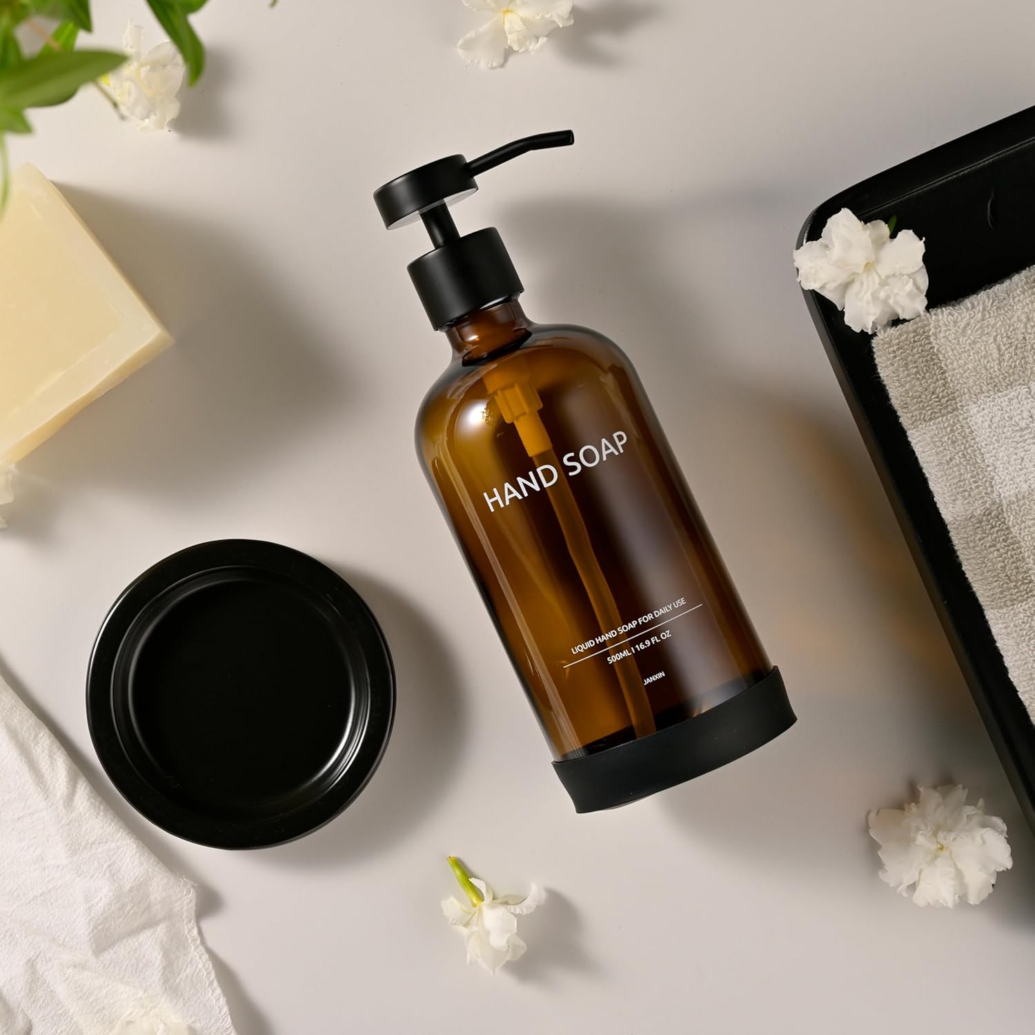 Glass Soap Dispenser Set by Janxin,Bathroom Soap Dispenser Set with Ceramic Tray,Luxury Bathroom Accessories,Modern Kitchen Decor (Amber(Hand Soap))