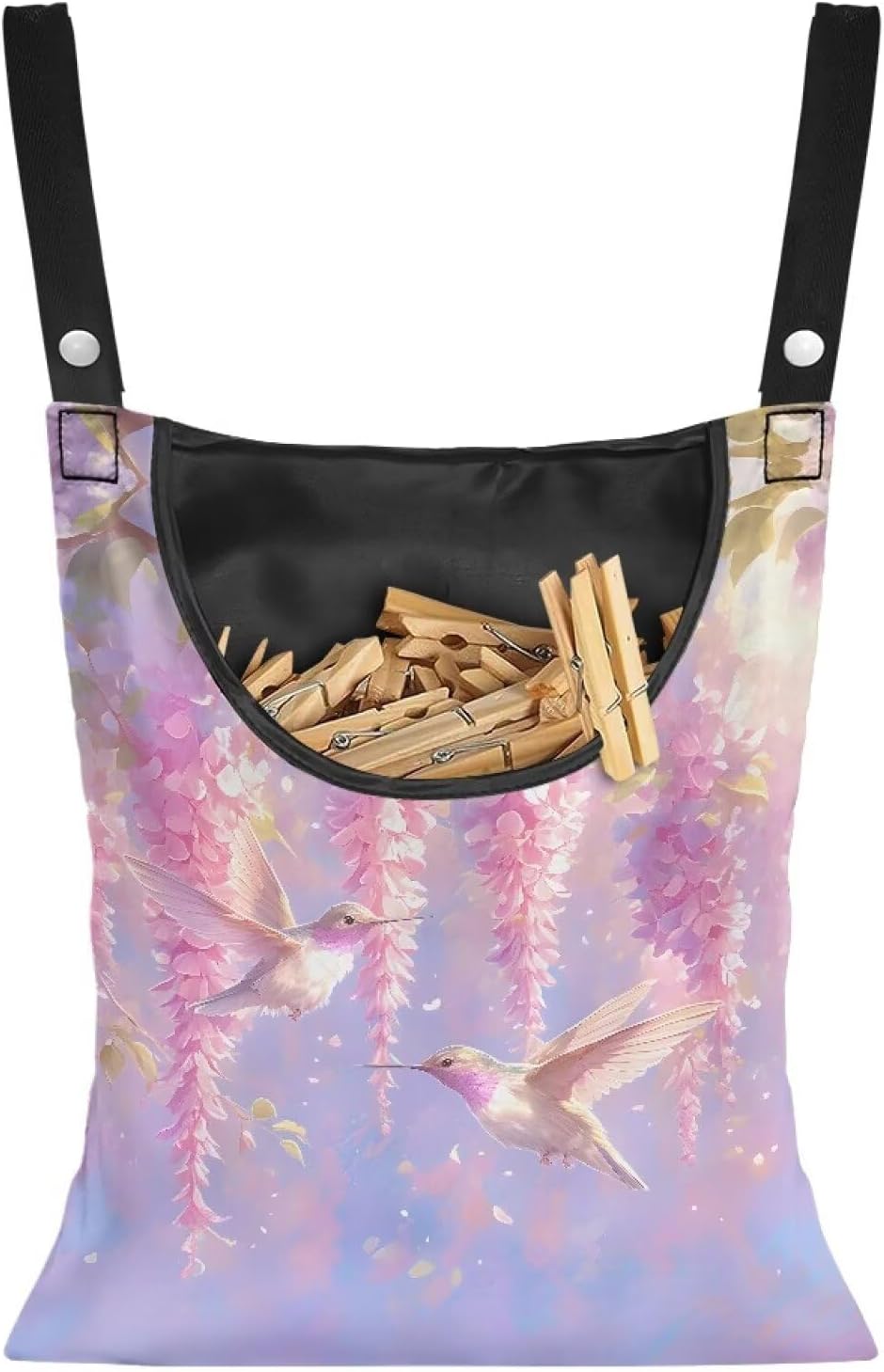 Clothespin Bag for Outdoor Laundry Clothesline and Clothes Pin Holder Clothespin Bag for Heavy Duty Outdoor Use - Hummingbird Flower