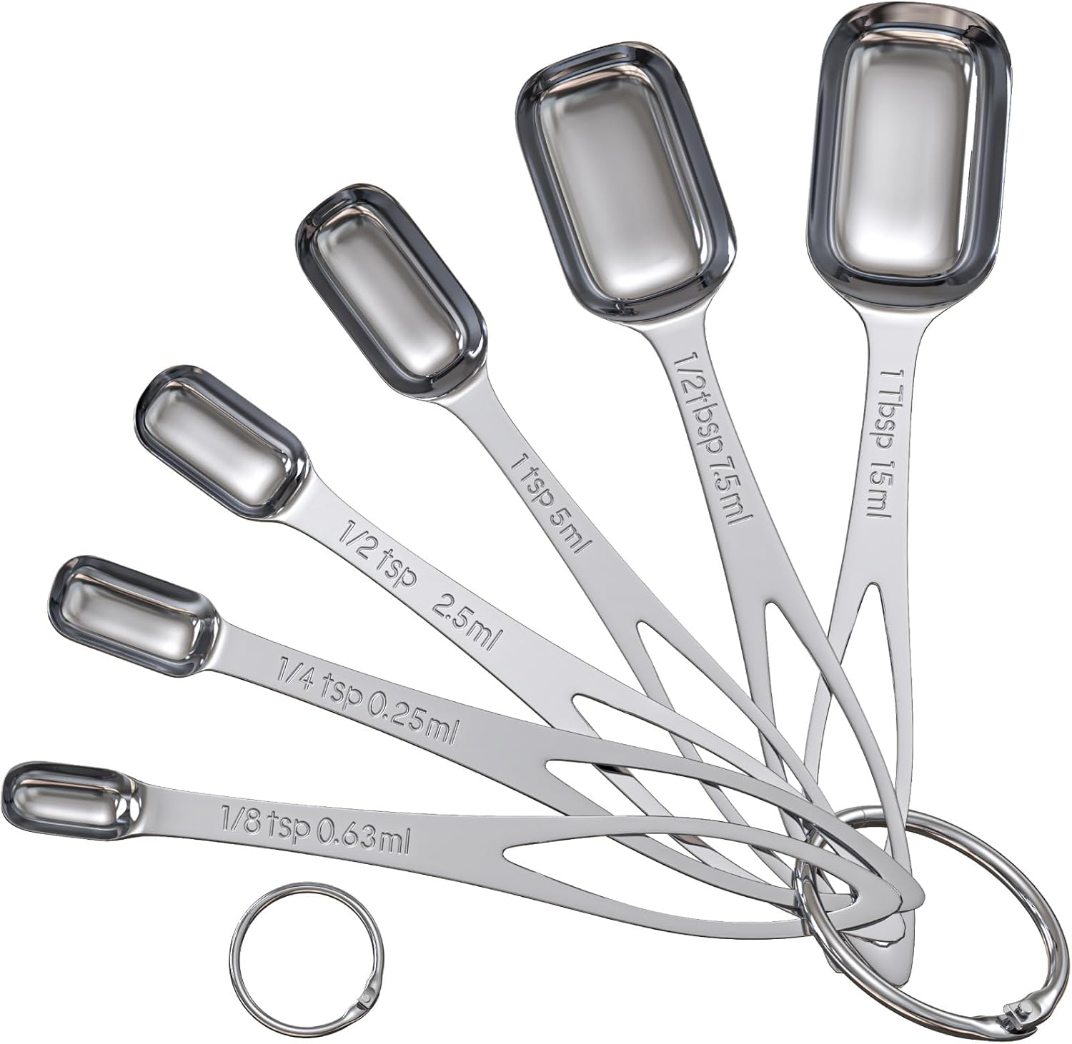 - 6 HIGH-FREQUENCY SIZES: It includes 1/8 tsp, 1/4 tsp, 1/2 tsp, 1 tsp, 1/2 tbsp, and 1 tbsp — perfect for any recipe; The metal measuring spoons are good for measuring both dry ingredients (flour, sugar, spice) and liquids (oil, vinegar, sauce)