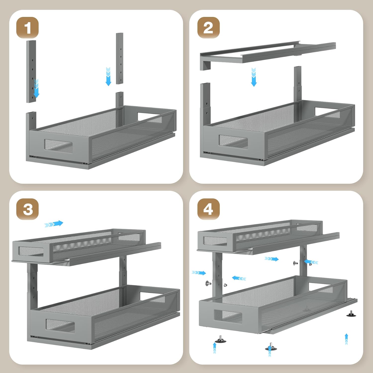 - 【Easy Installation】Say goodbye to complicated assembly! With 90% of the components pre-assembled, simply tighten 2 screws and your spacious undersink organizers is ready in just 40 seconds.