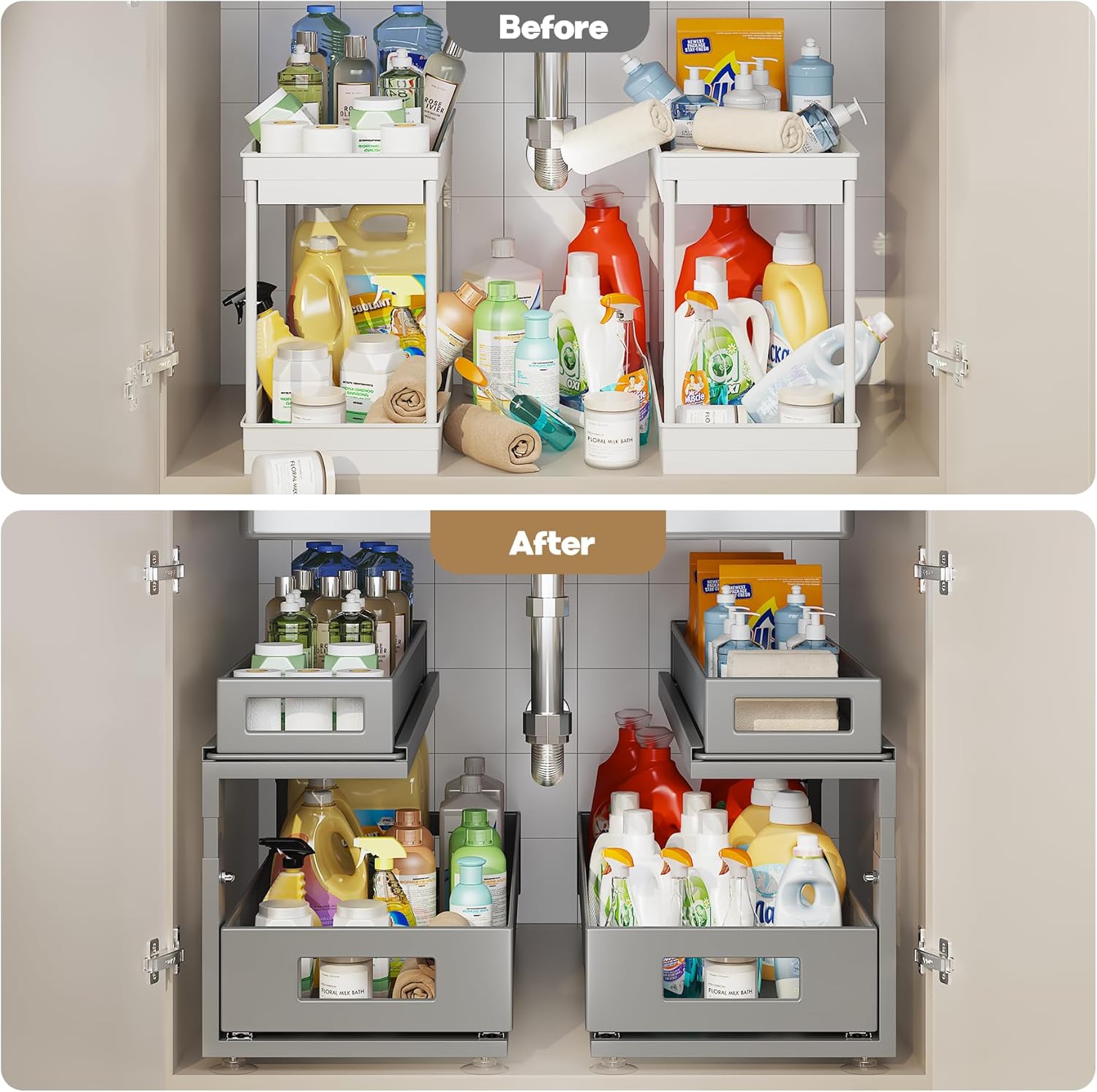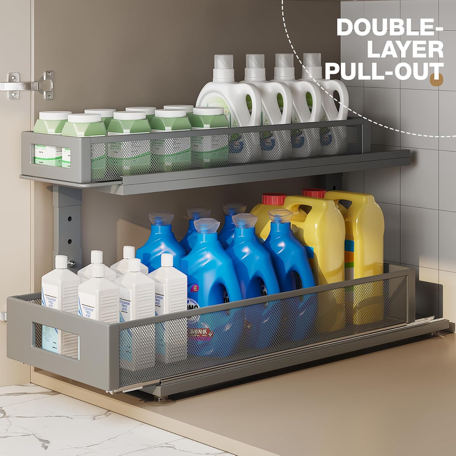- 【Supreme-Smooth Glides】Built with heavy-duty ball-bearing slides,pull out cabinet organizer glides out smoothly and quietly,even when storing bottles,detergents,or heavy cleaning supplies.