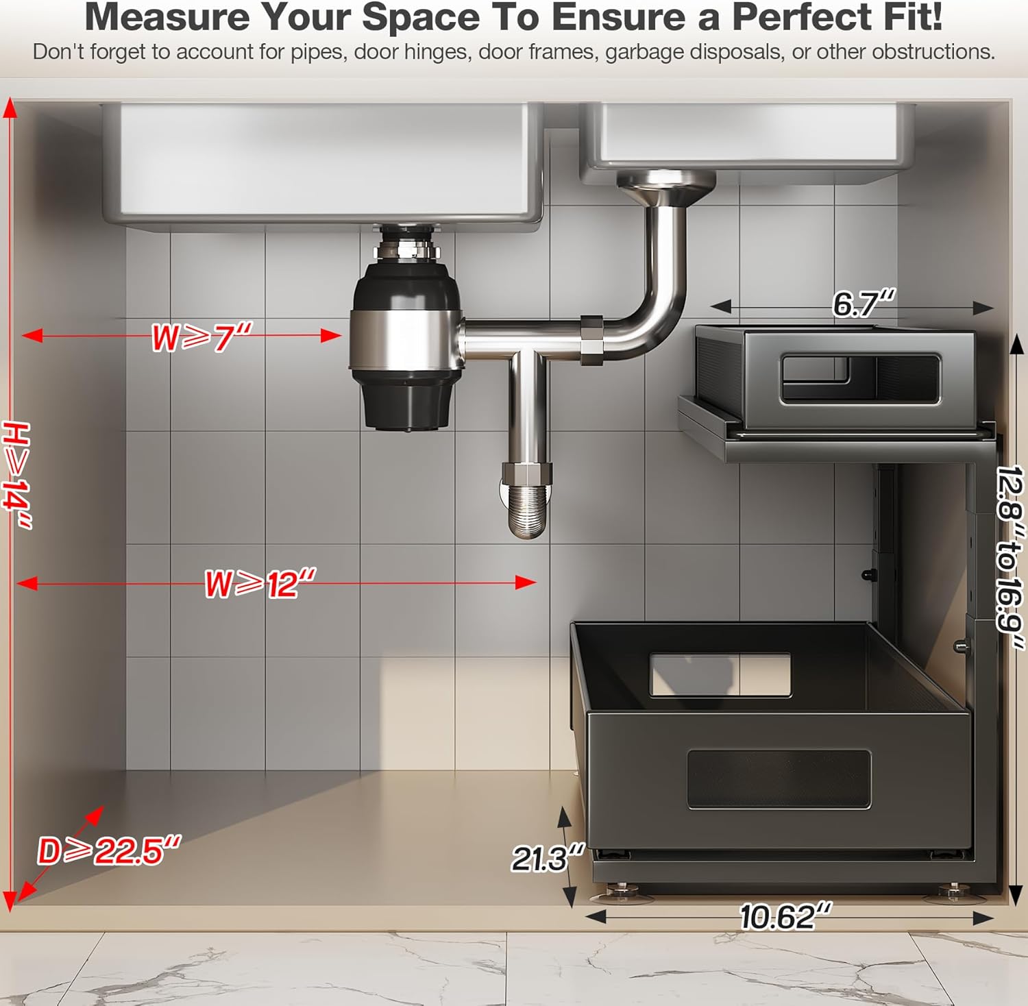 - 【Height Moves to Fit Your Storage Needs】Crafted with an L-shaped design and 5 adjustable heights(12.8–16.9 in),under sink pull out organizer seamlessly adapts to your cabinet, flexibly adjusting its height to navigate around pipes while maximizing vertical storage.
