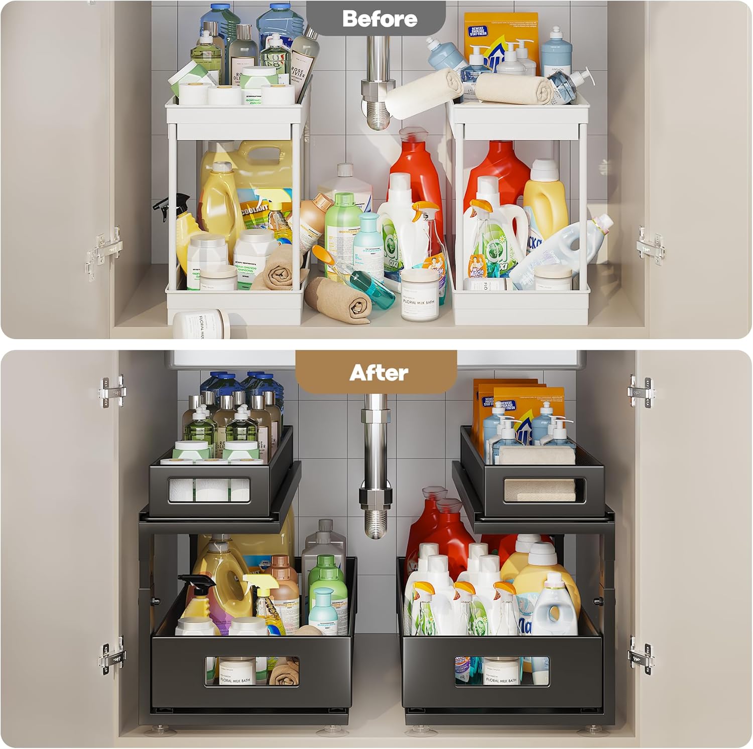 2 Pack 21.3IN-Depth Under Sink Organizer with Next-Gen Ball-Bearing Slides,2-Tier Pull Out Cabinet Storage,Height Adjustable Drawer Shelf for Bathroom,Kitchen,Laundry,Cabinet,Pantry-Black
