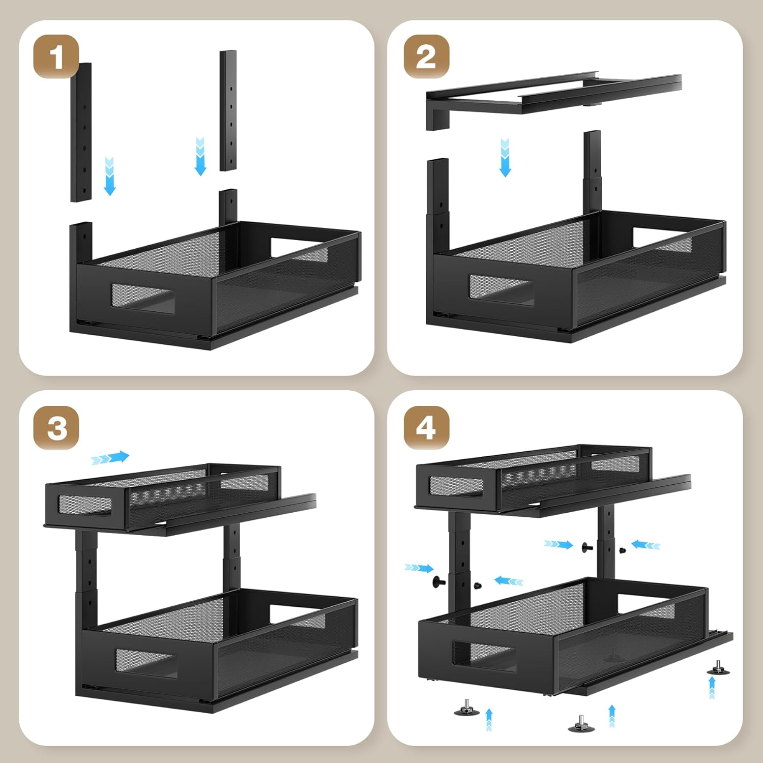 - 【Easy Installation】Say goodbye to complicated assembly! With 90% of the components pre-assembled, simply tighten 2 screws and your spacious undersink organizers is ready in just 40 seconds.