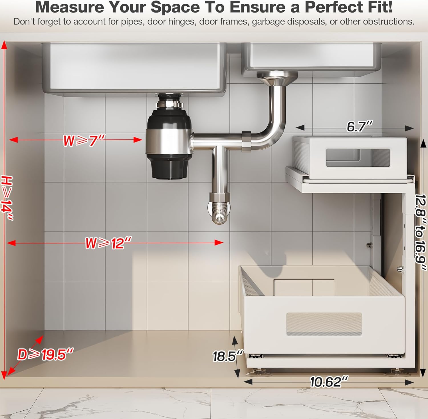 2 Pack 18.5IN-Depth Under Sink Organizer With Next-Gen Ball-Bearing Slides,2-Tier Pull Out Cabinet Storage,Height Adjustable Drawer Shelf for Bathroom,Kitchen,Laundry,Cabinet,Pantry-White