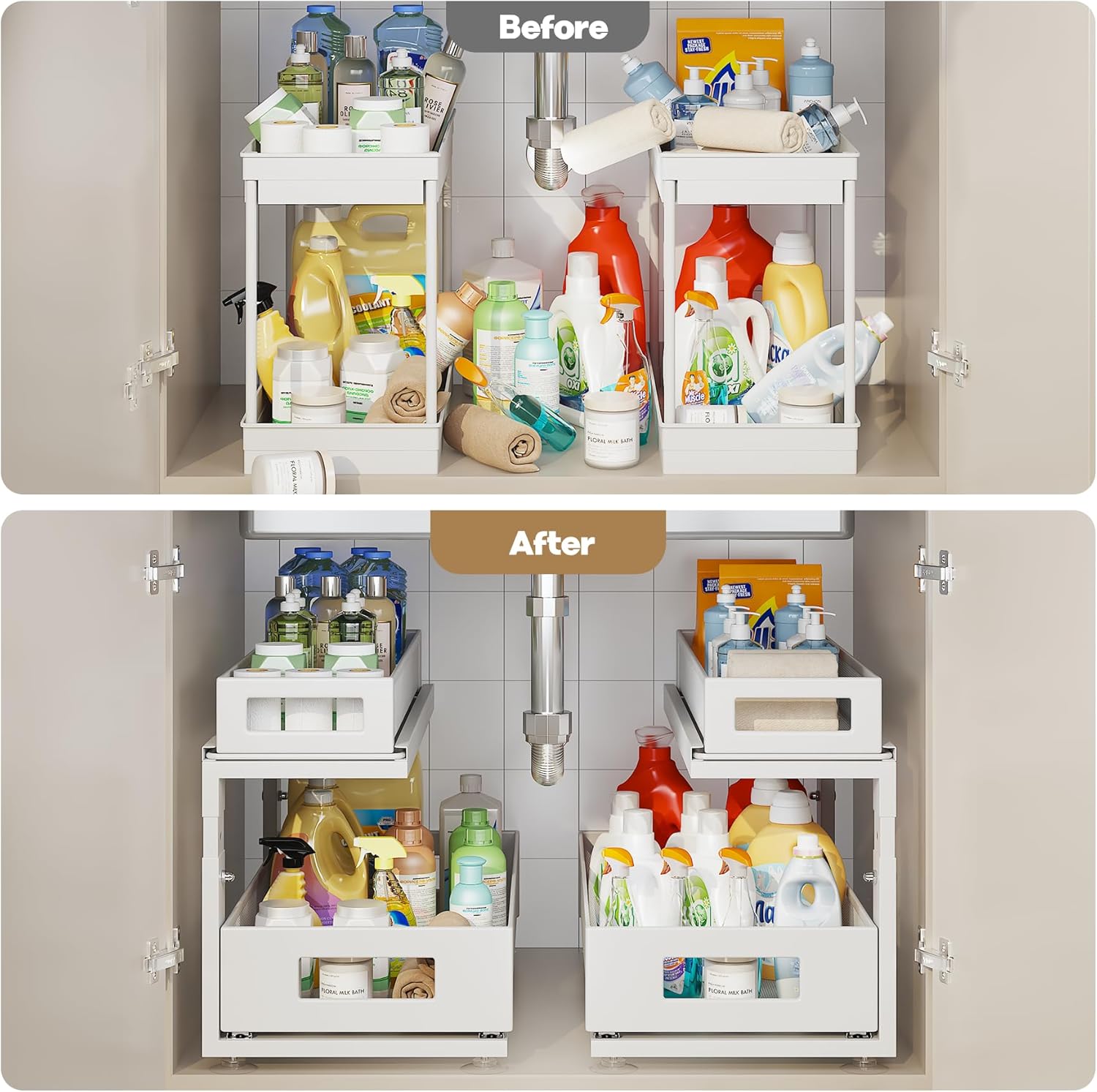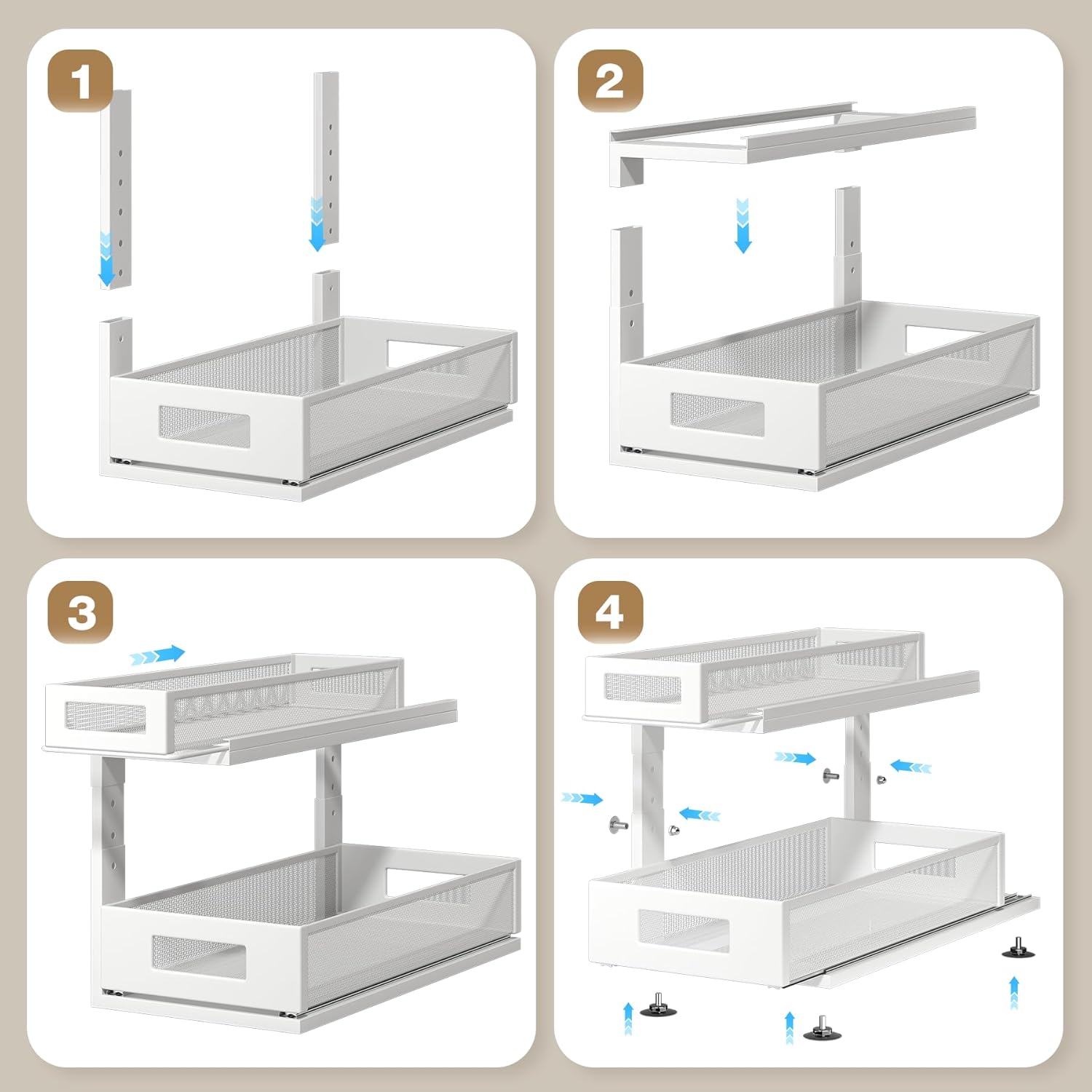 - 【Easy Installation】Say goodbye to complicated assembly! With 90% of the components pre-assembled, simply tighten 2 screws and your spacious undersink organizers is ready in just 40 seconds.