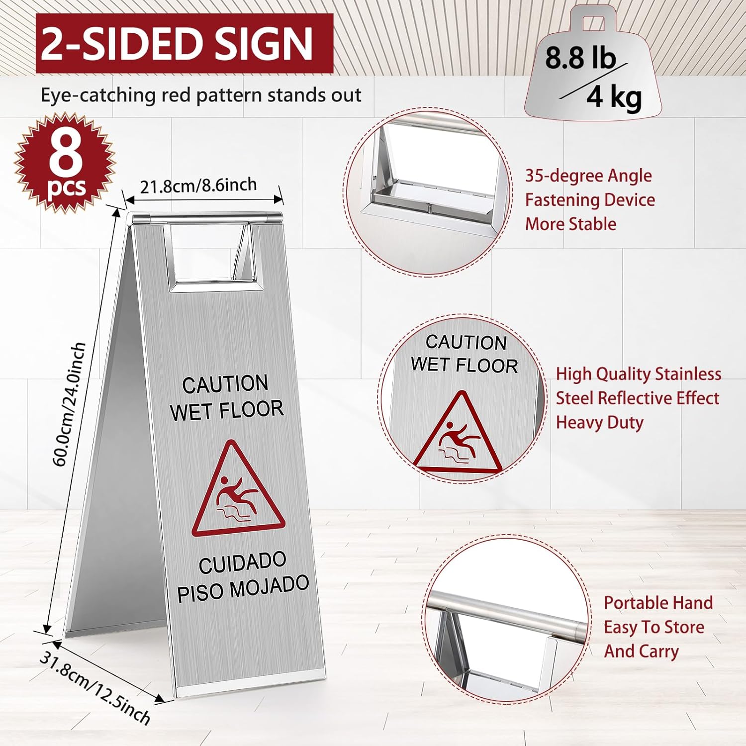 8 Pcs 24 Inch Stainless Steel Wet Floor Sign 8.8 Pound Caution Wet Floor Sign Bulk Double Sided Portable Foldable Bilingual Safety Warning for Kitchen Restaurant Restroom Avoid Fall (Silver)